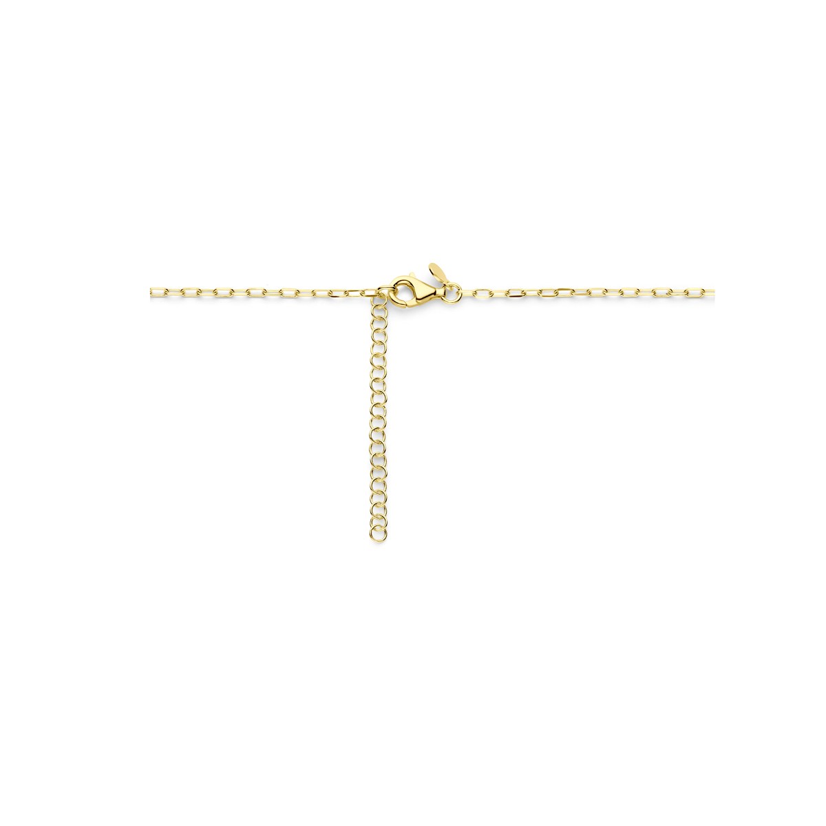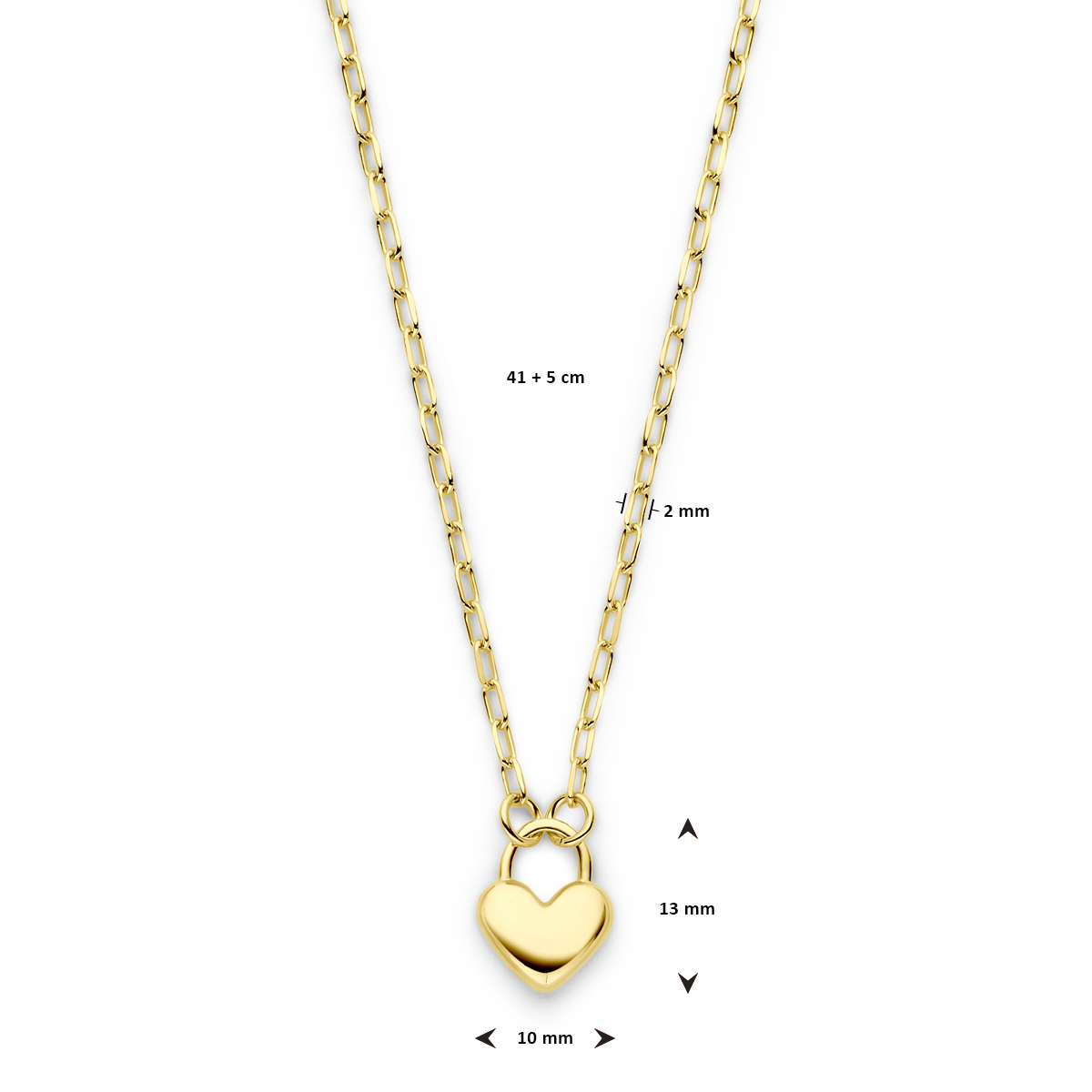 Geelgoud op 925 zilveren collier met een hart. Het collier heeft een draaglengte van 41cm met 5cm extensie. De schakelbreedte is 2.0mm. Het hart heeft een afmeting van 13x10mm. Uitgevoerd met een karabijn sluiting. Geen garantie op de plating.