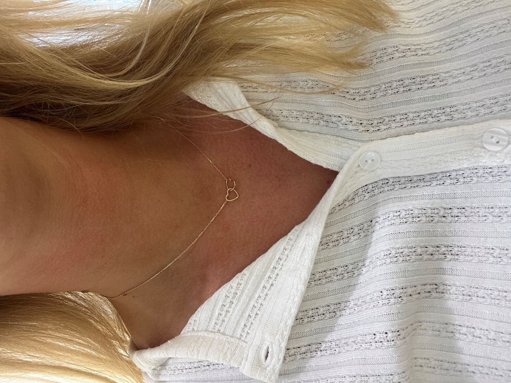 14k Geelgouden collier uitgevoerd met twee hartjes. Het collier heeft draaglengtes van 40, 42 en 44cm. De hartjes hebben beide een afmeting van 7x8mm.