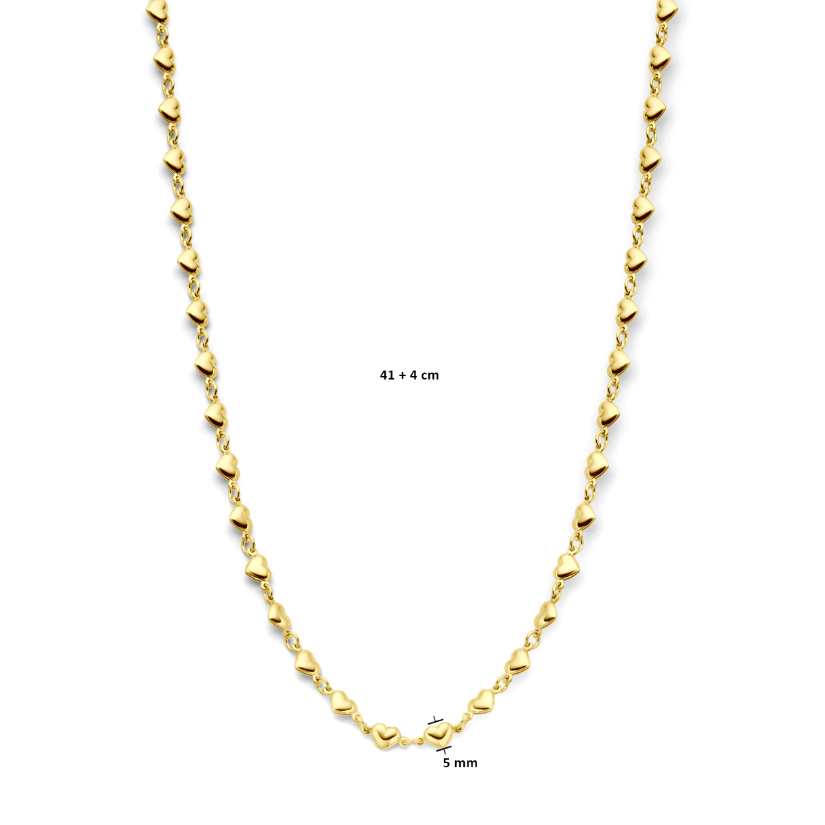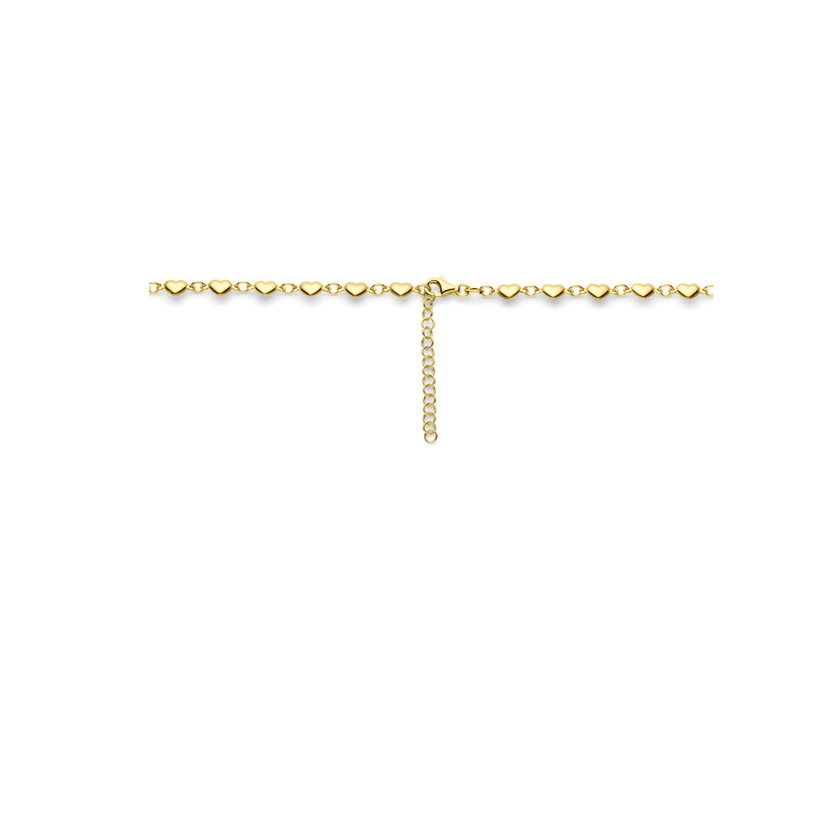 Geelgoud op 925 zilveren collier uitgevoerd met hartjes en een karabijn sluiting. Het collier heeft een draaglengte van 41cm en een extensie van 4cm. Geen garantie op de plating.