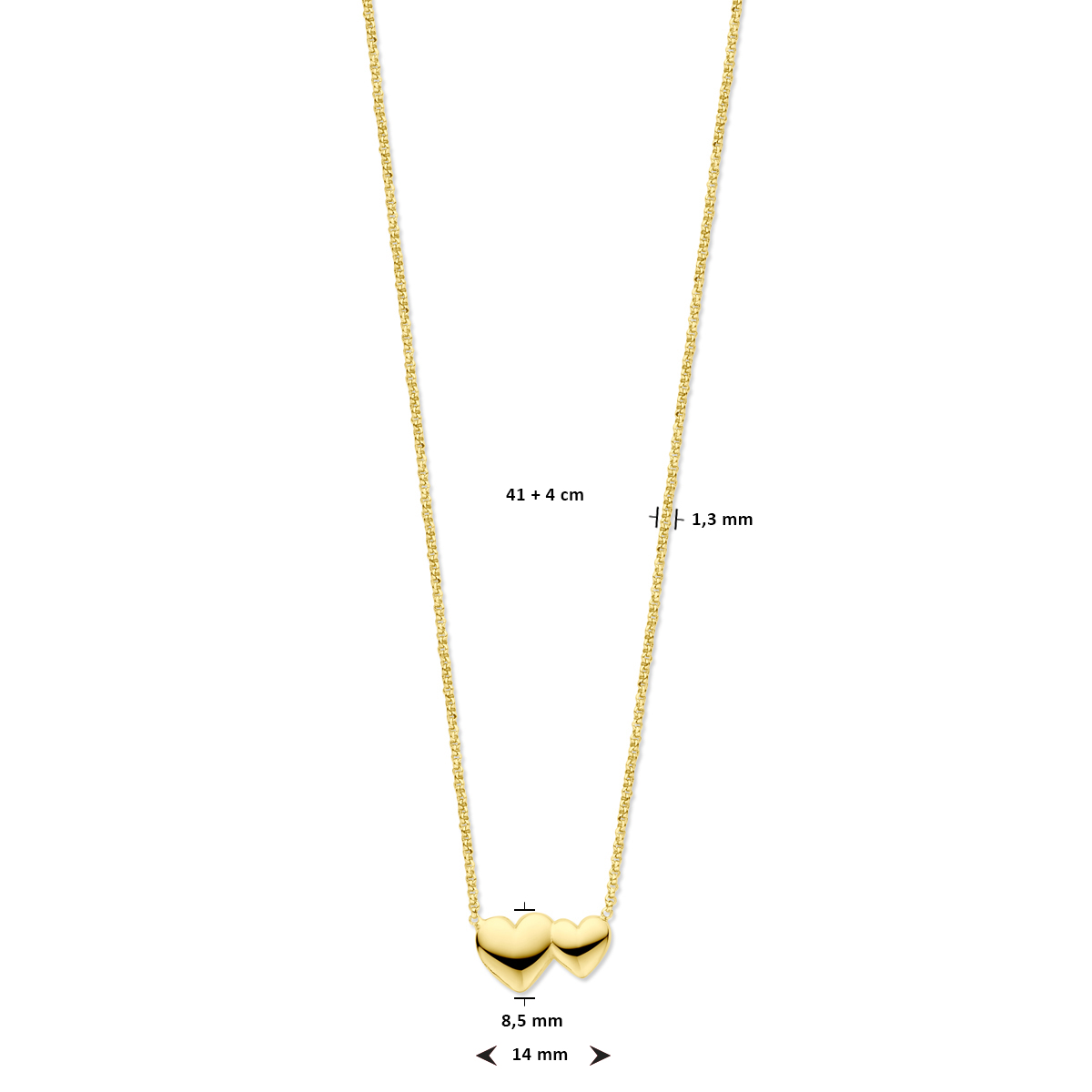Geelgoud op 925 zilveren collier uitgevoerd met twee hartjes. Het collier heeft een schakelbreedte van 1.3mm en een draaglengte van 41cm met 4cm extensie.