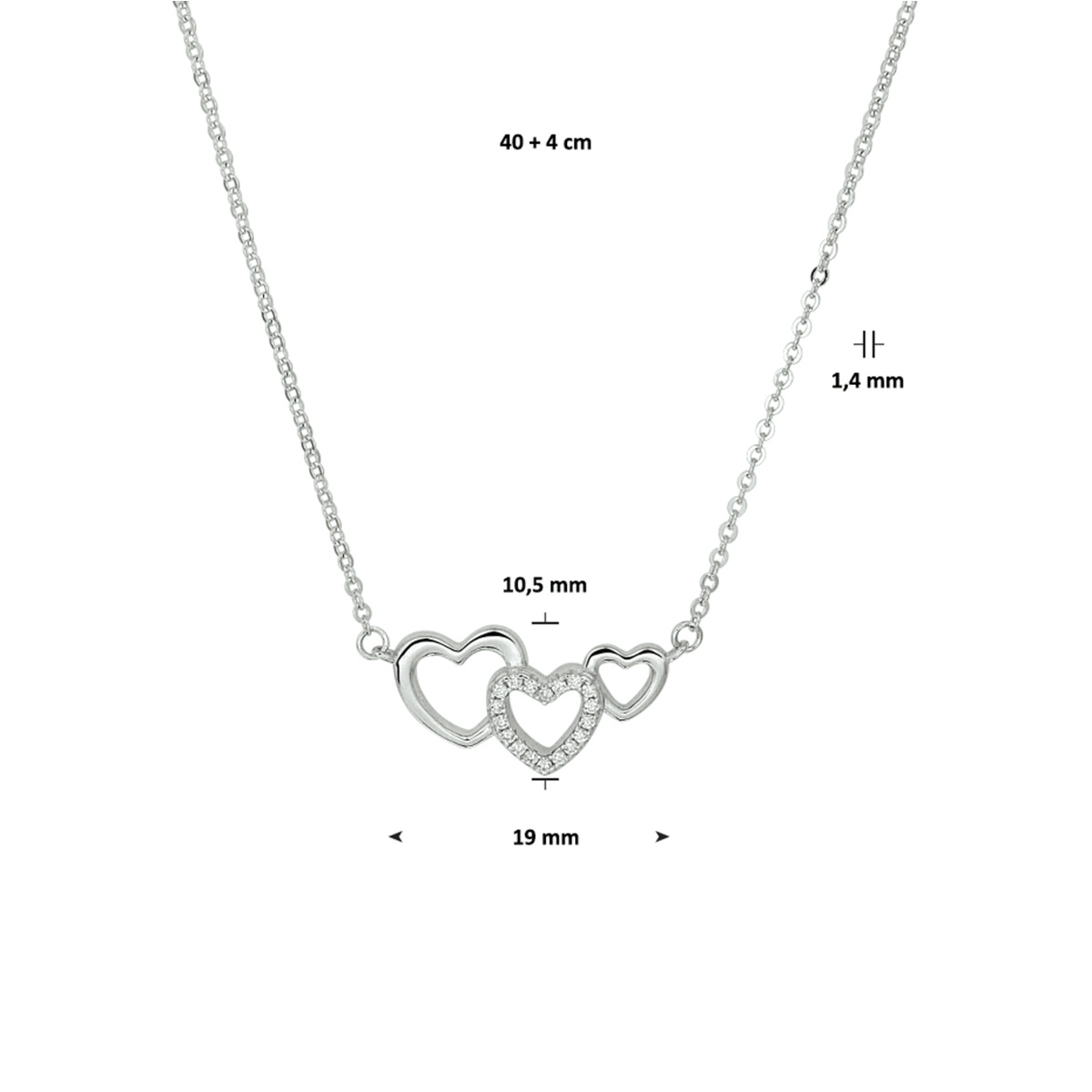 Beschrijving: Romantisch gerhodineerd zilveren collier met hartjes en schitterende zirkonia. Met een draaglengte van 40cm en een extensie van 4cm uitgevoerd met een stevige karabijn sluiting. Tip: Leuk om kado te geven! Info: Gerhodineerd zilver is door de rhodiumlaag beter bestand tegen verkleuren en krassen.