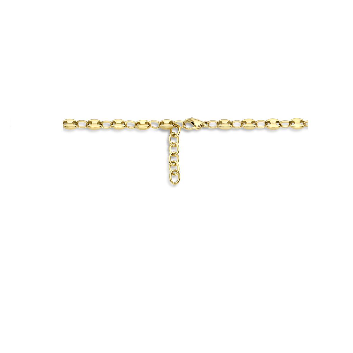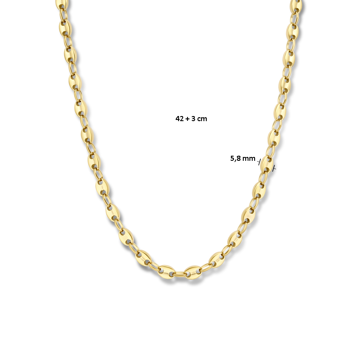 Stalen collier met goudkleurige ion plating en is uitgevoerd met karabijnsluiting. Het collier heeft een schakelbreedte van 5.8mm en een draaglengte van 42cm met een extensie van 3cm. Geen garantie op de plating.