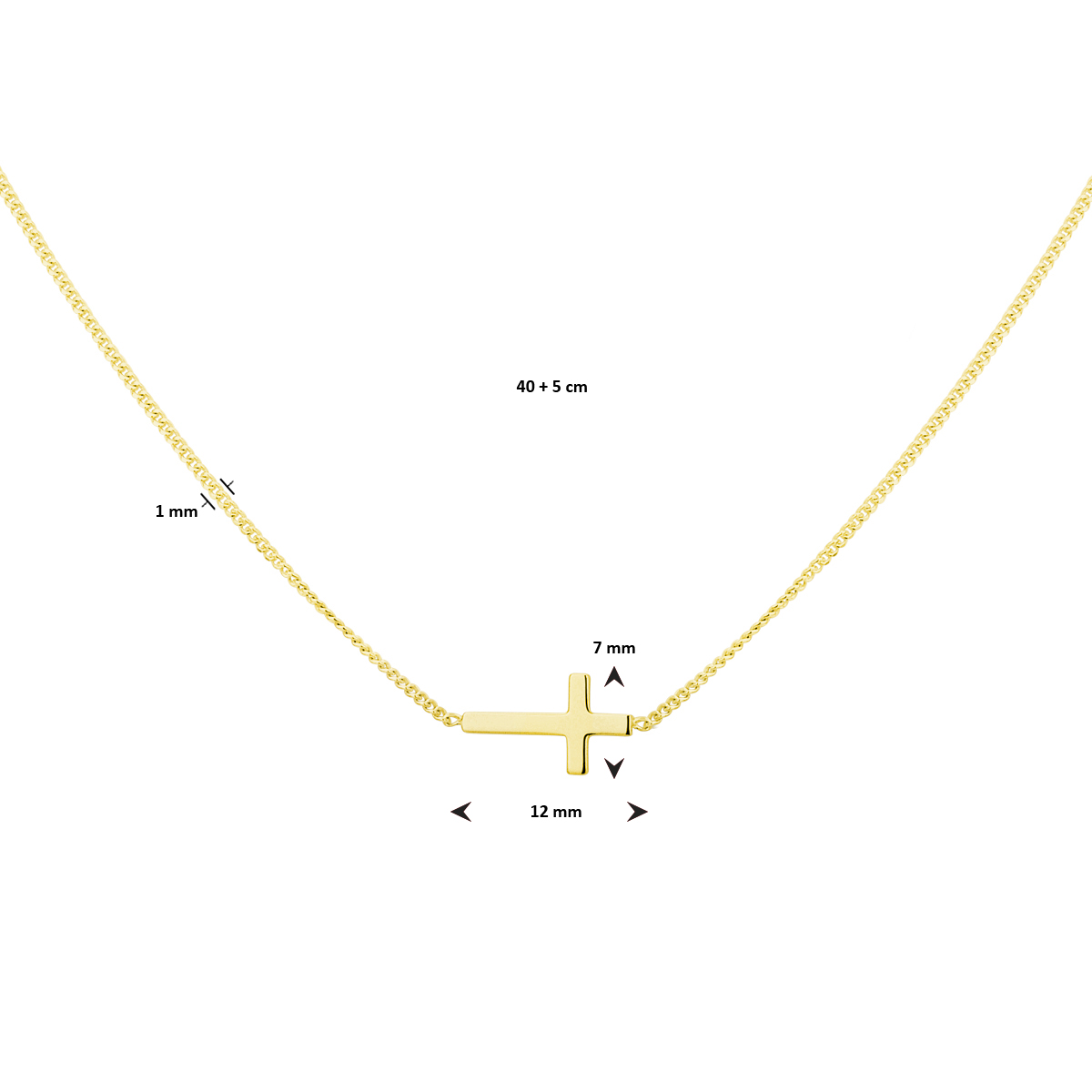 Verguld op 925 zilveren collier uitgevoerd met een kruis en een karabijn sluiting. Het collier heeft een draaglengte van 40cm en een extensie van 5cm. De schakelbreedte is 1.0mm. Geen garantie op plating.