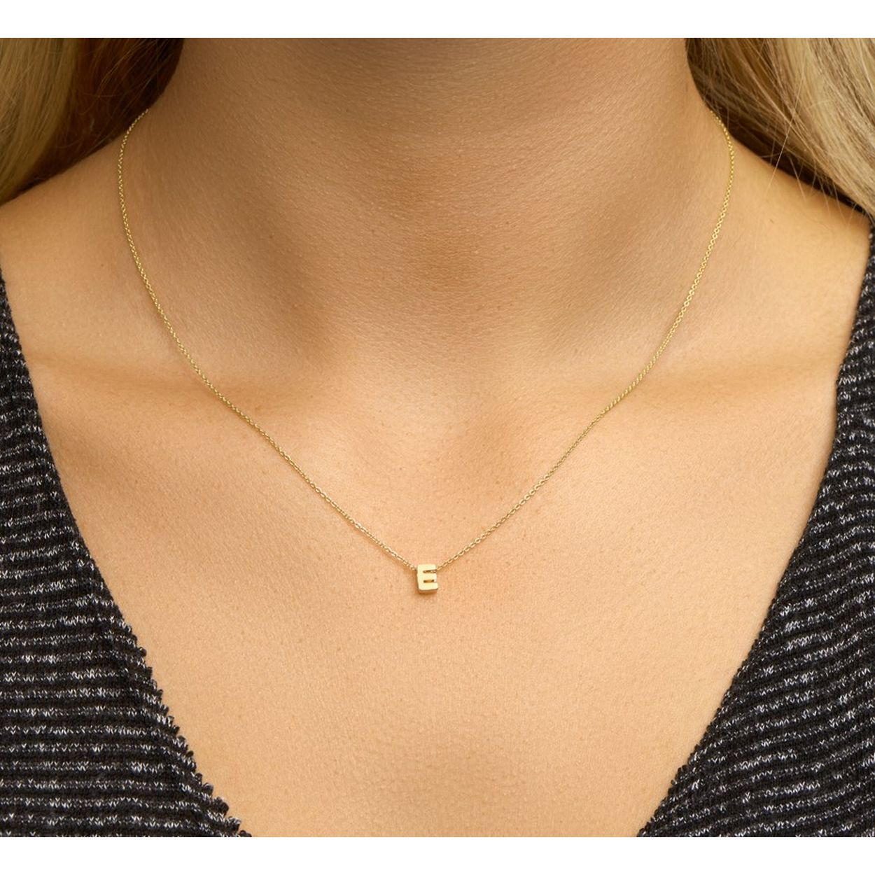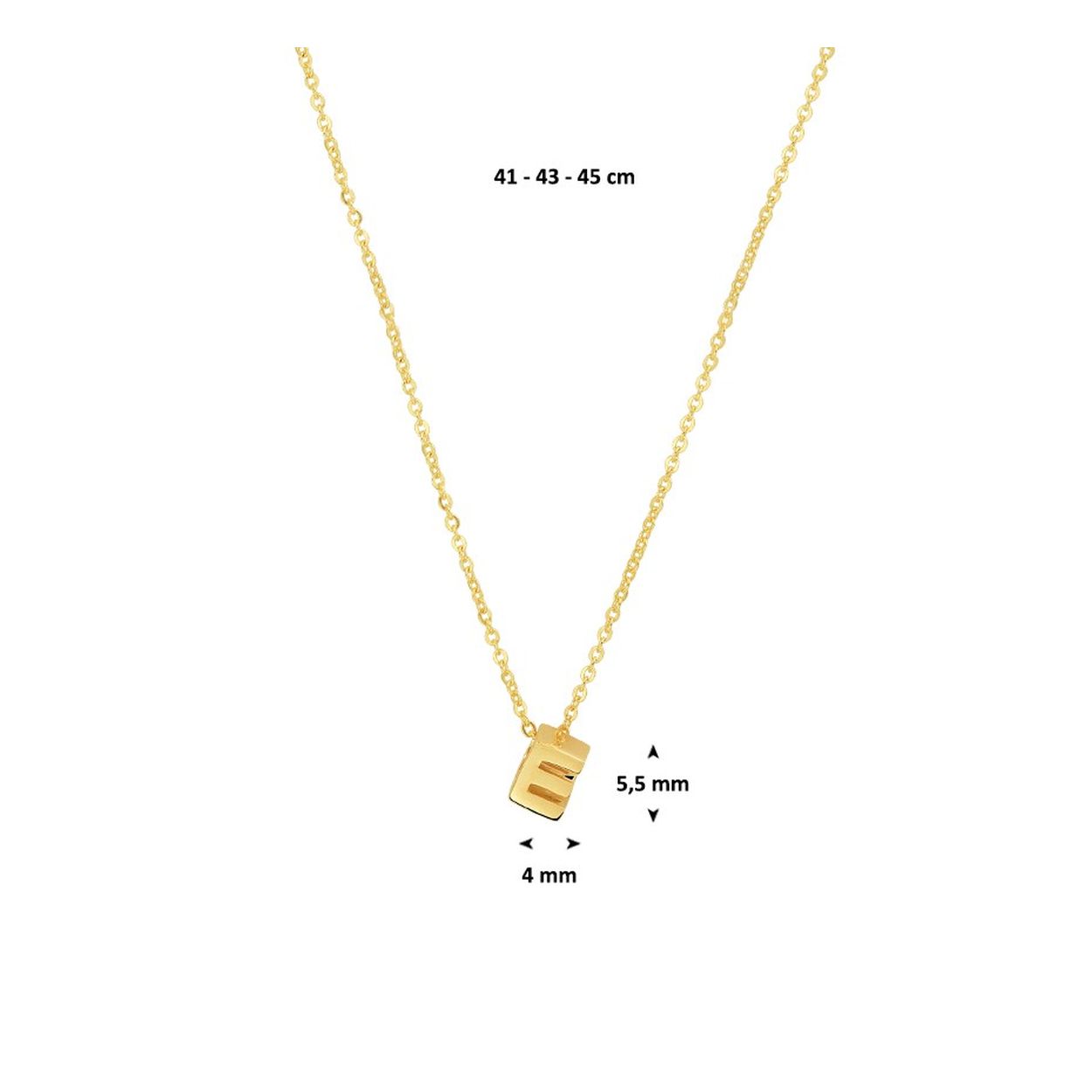 14k Geelgouden anker collier uitgevoerd met de letter E. Het collier heeft draaglengtes van 41, 43 en 45cm. De letter heeft een afmeting van 5.5x4mm.