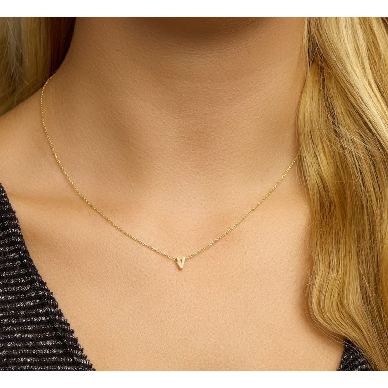 14k Geelgouden anker collier uitgevoerd met de letter V. Het collier heeft draaglengtes van 41, 43 en 45cm. De letter heeft een afmeting van 5.5x4.5mm.
