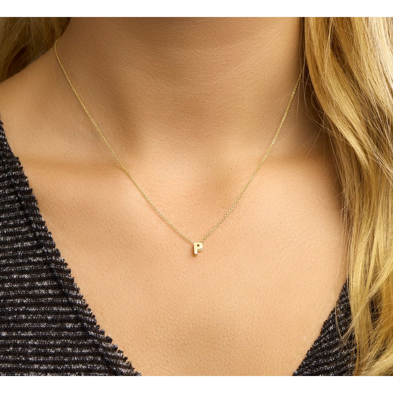 14k Geelgouden anker collier uitgevoerd met de letter P. Het collier heeft draaglengtes van 41, 43 en 45cm. De letter heeft een afmeting van 5.5x4mm.
