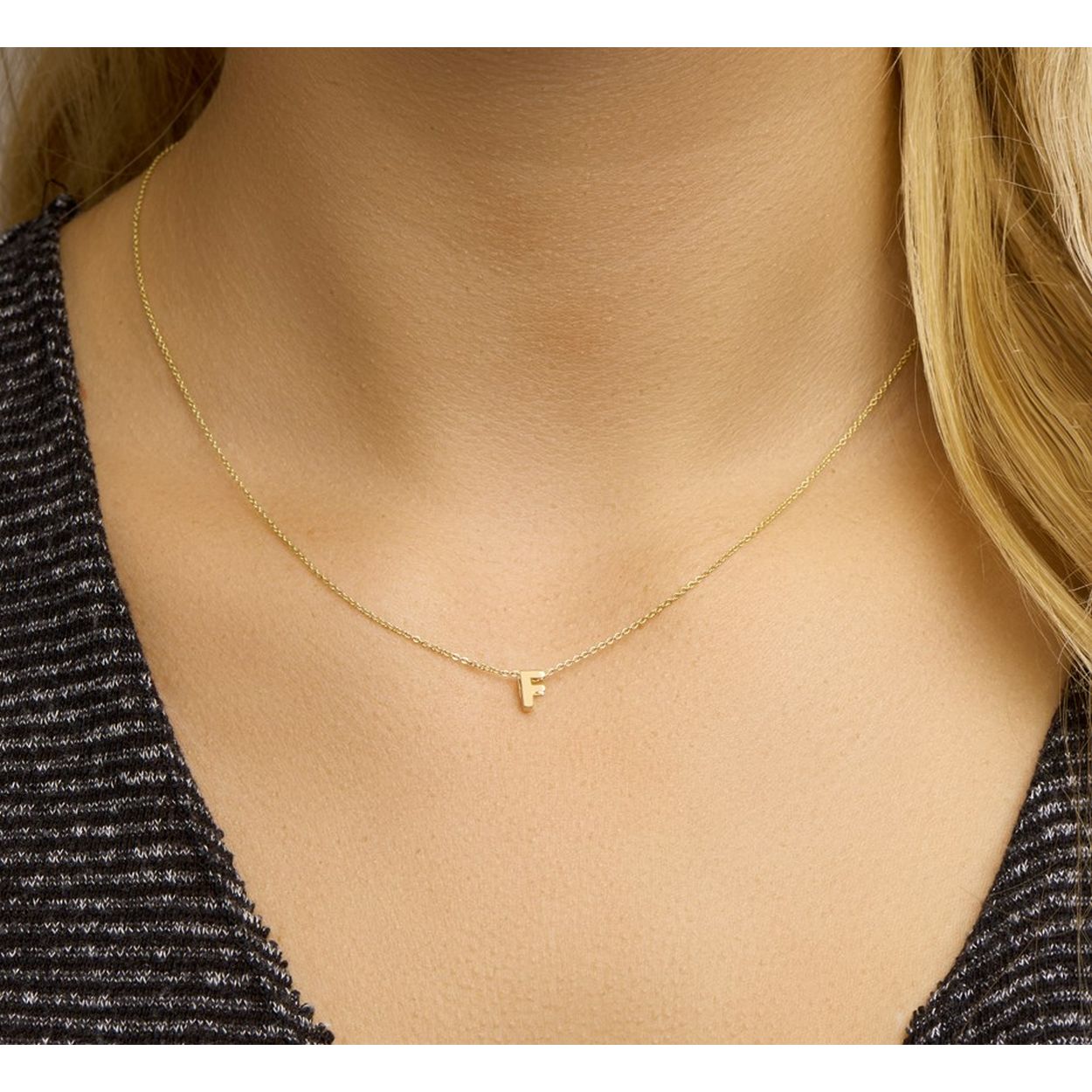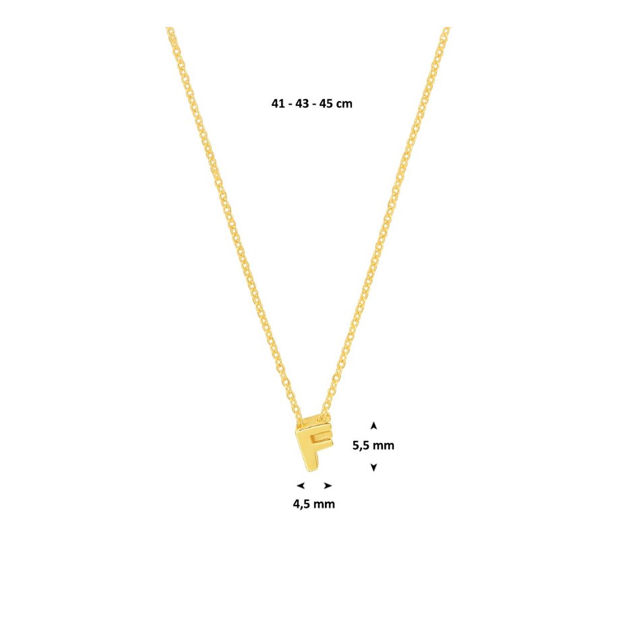 14k Geelgouden anker collier uitgevoerd met de letter F. Het collier heeft draaglengtes van 41, 43 en 45cm. De letter heeft een afmeting van 5.5x4.5mm.