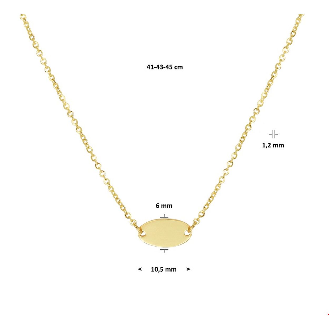 Stijlvol  geelgouden anker collier uitgevoerd met een ovaal plaatje van 6x10.5mm. Het collier heeft draaglengtes van 41 43 en 45cm en is uitgevoerd met een stevige karabijn sluiting. Minimalistisch ovaal design voor een trendy uitstraling.