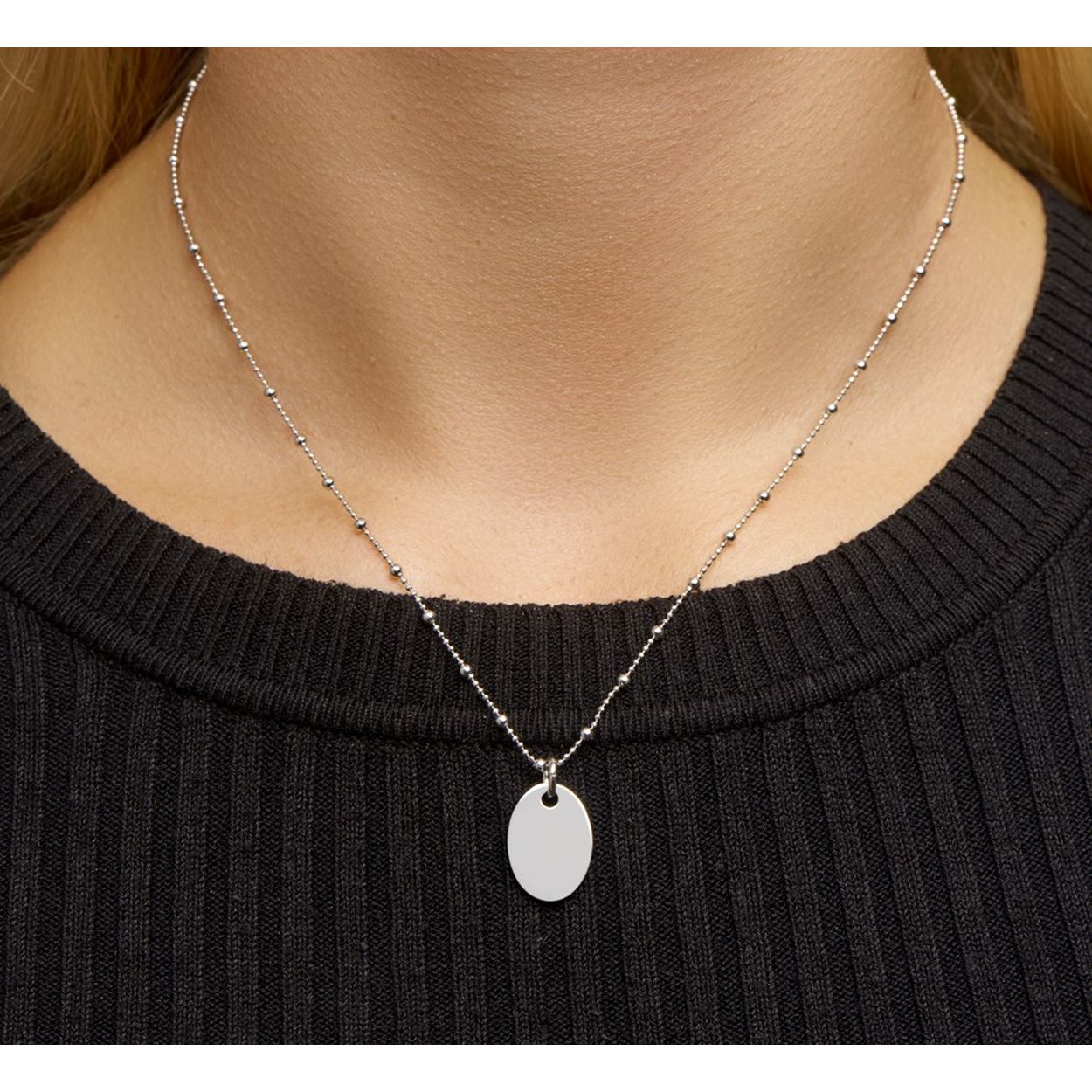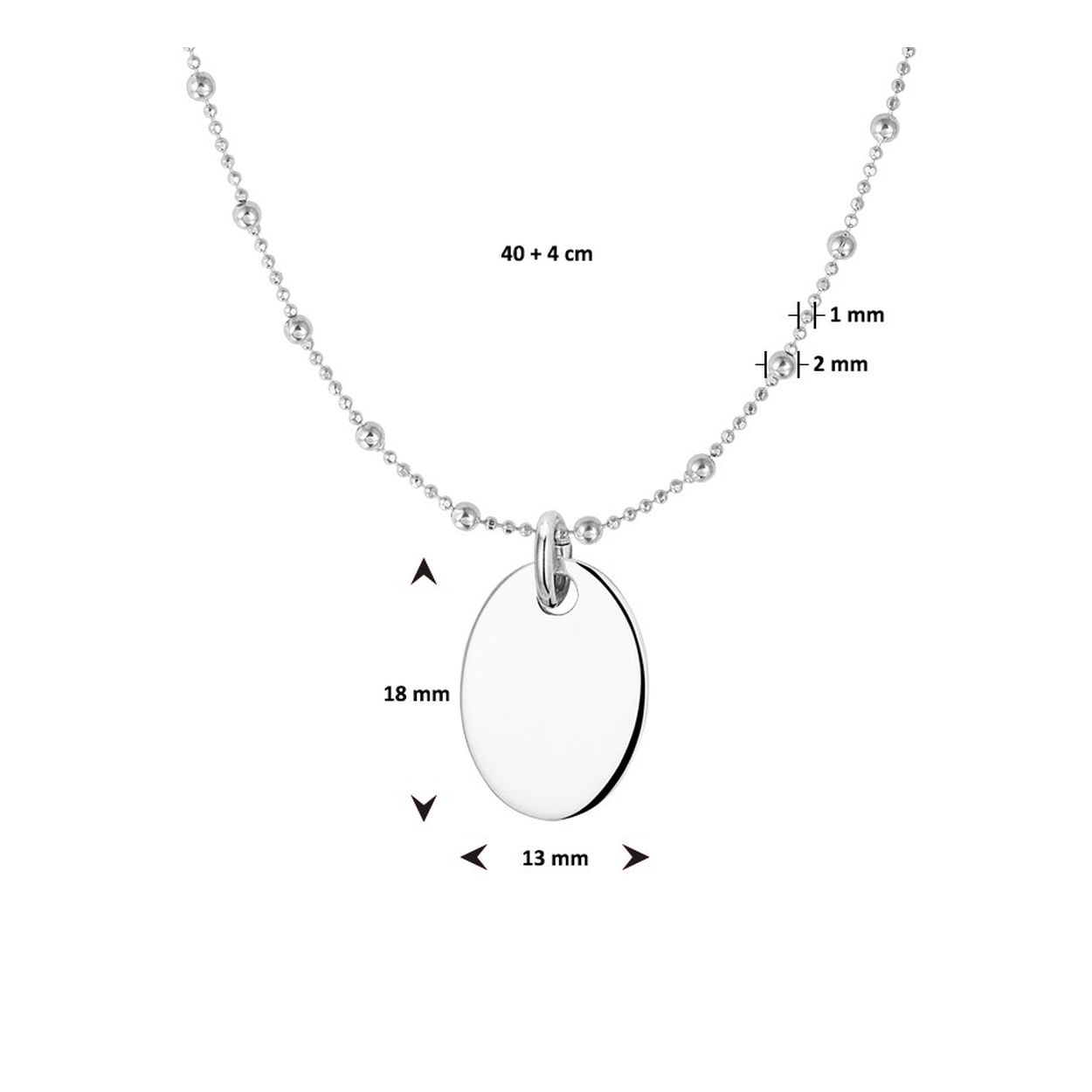 Gerhodineerd 925 zilveren collier uitgevoerd met een ovale graveerhanger en een stevige karabijn sluiting. Het collier heeft een draaglengte van 40cm en een extensie van 4cm. De hanger heeft een afmeting van 18x13mm. Info: Gerhodineerd zilver is door de rhodiumlaag beter bestand tegen verkleuren en krassen.