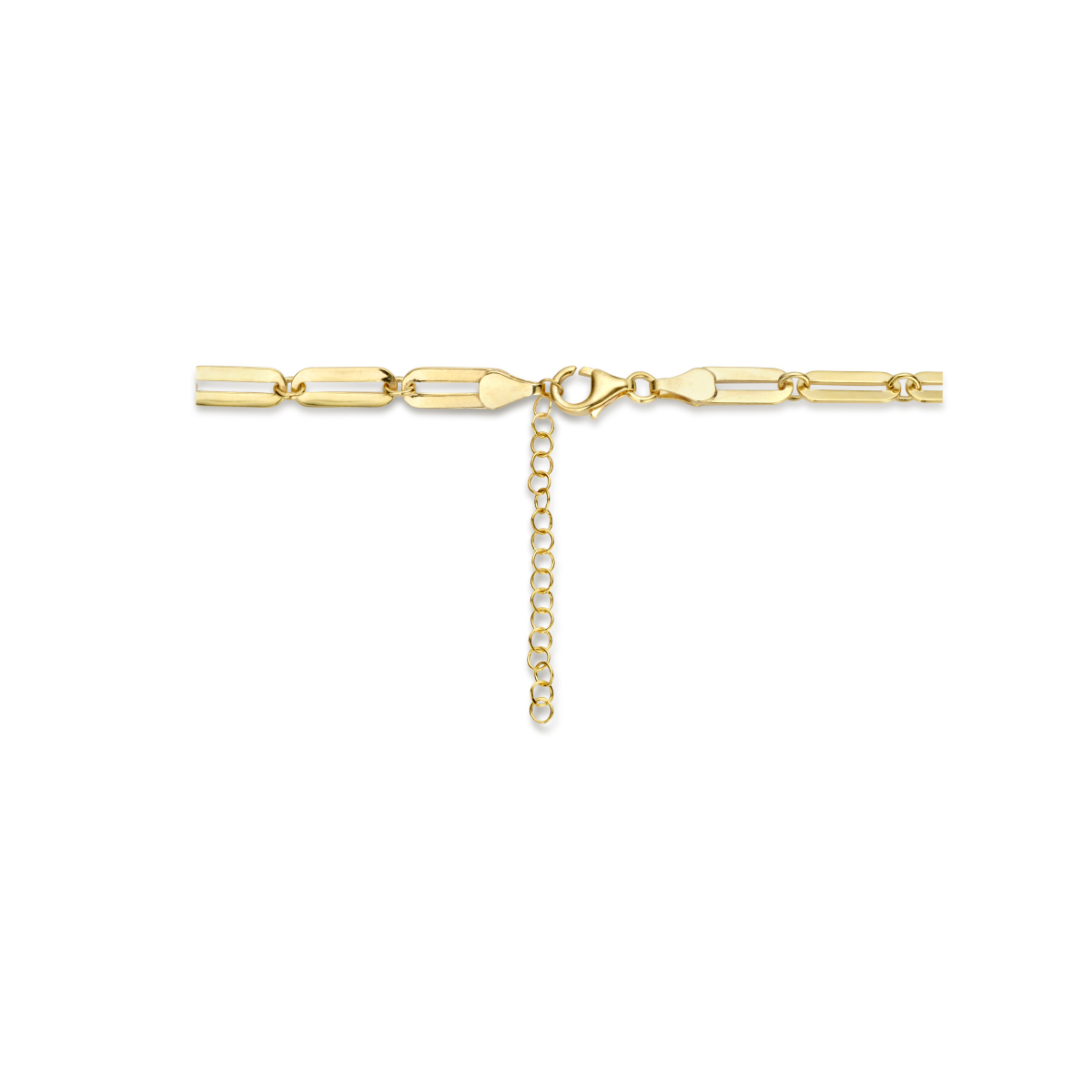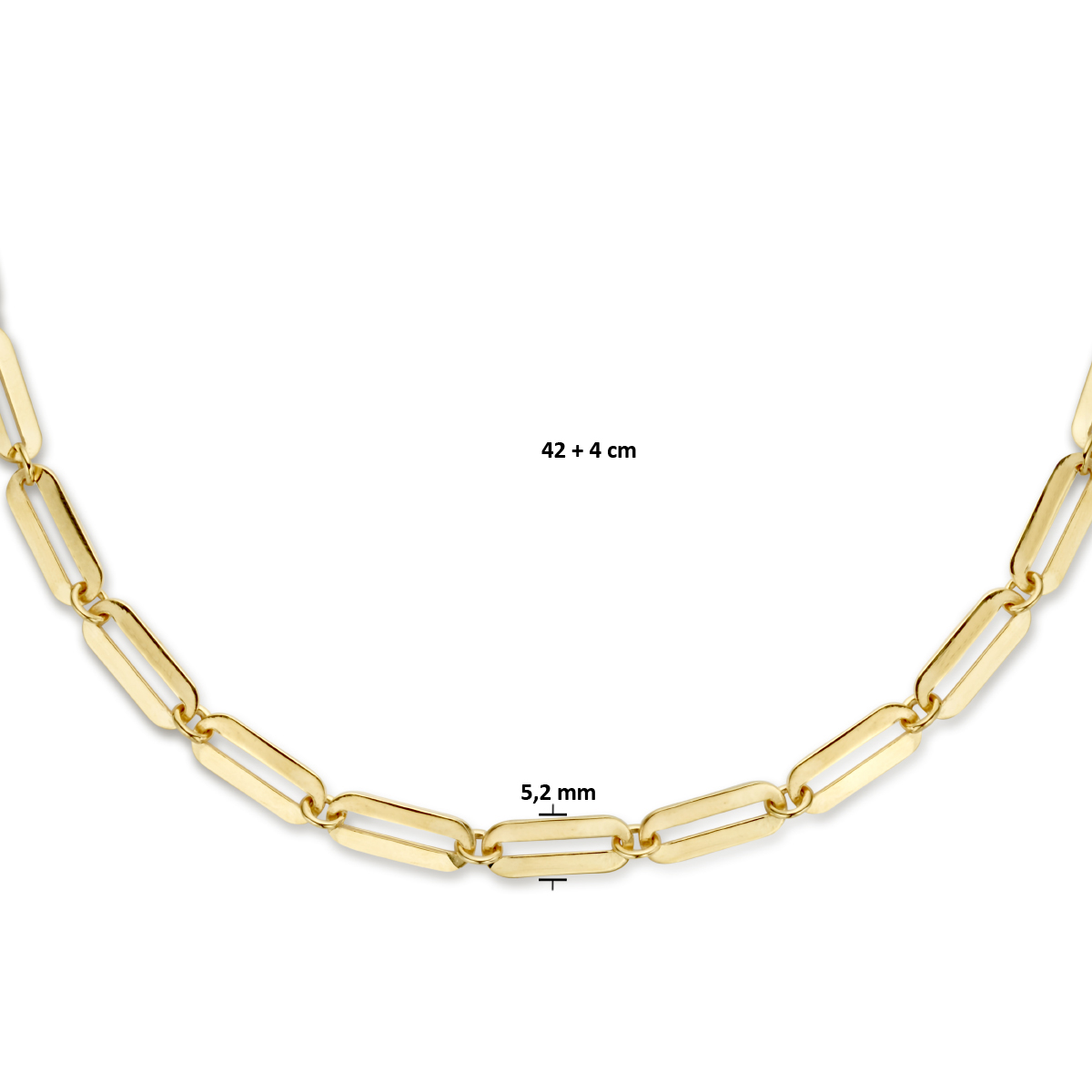 Geelgoud op 925 zilveren collier met een schakelbreedte van 5.0mm. Het collier heeft een draaglengte van 41cm en een extensie van 4cm. Uitgevoerd met een karabijn sluiting. Geen garantie op plating.