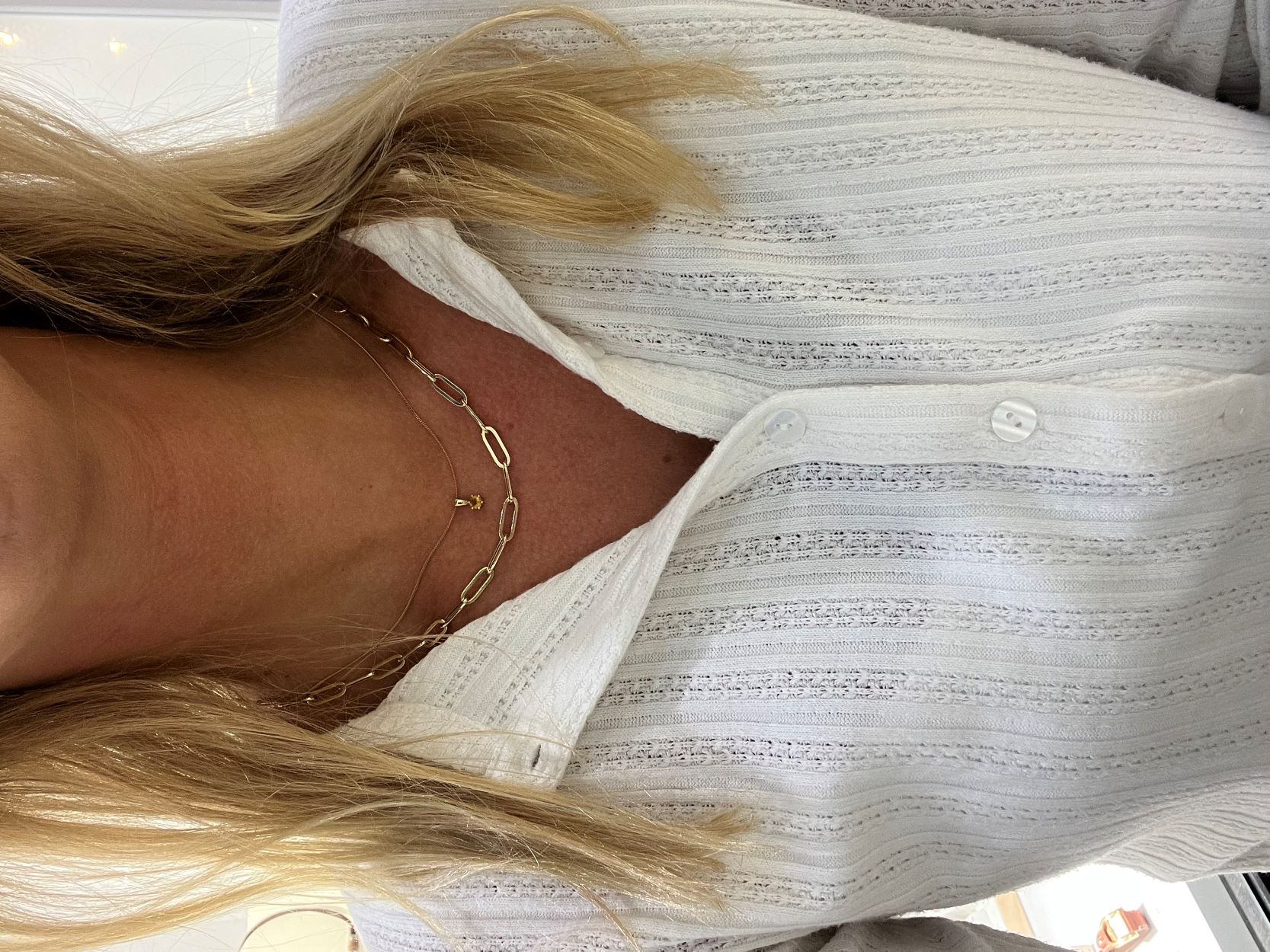 14k Geelgouden paperclip collier met een schakelbreedte van 5mm. Het collier heeft draaglengte 44 cm. Uitgevoerd met een karabijn sluiting.