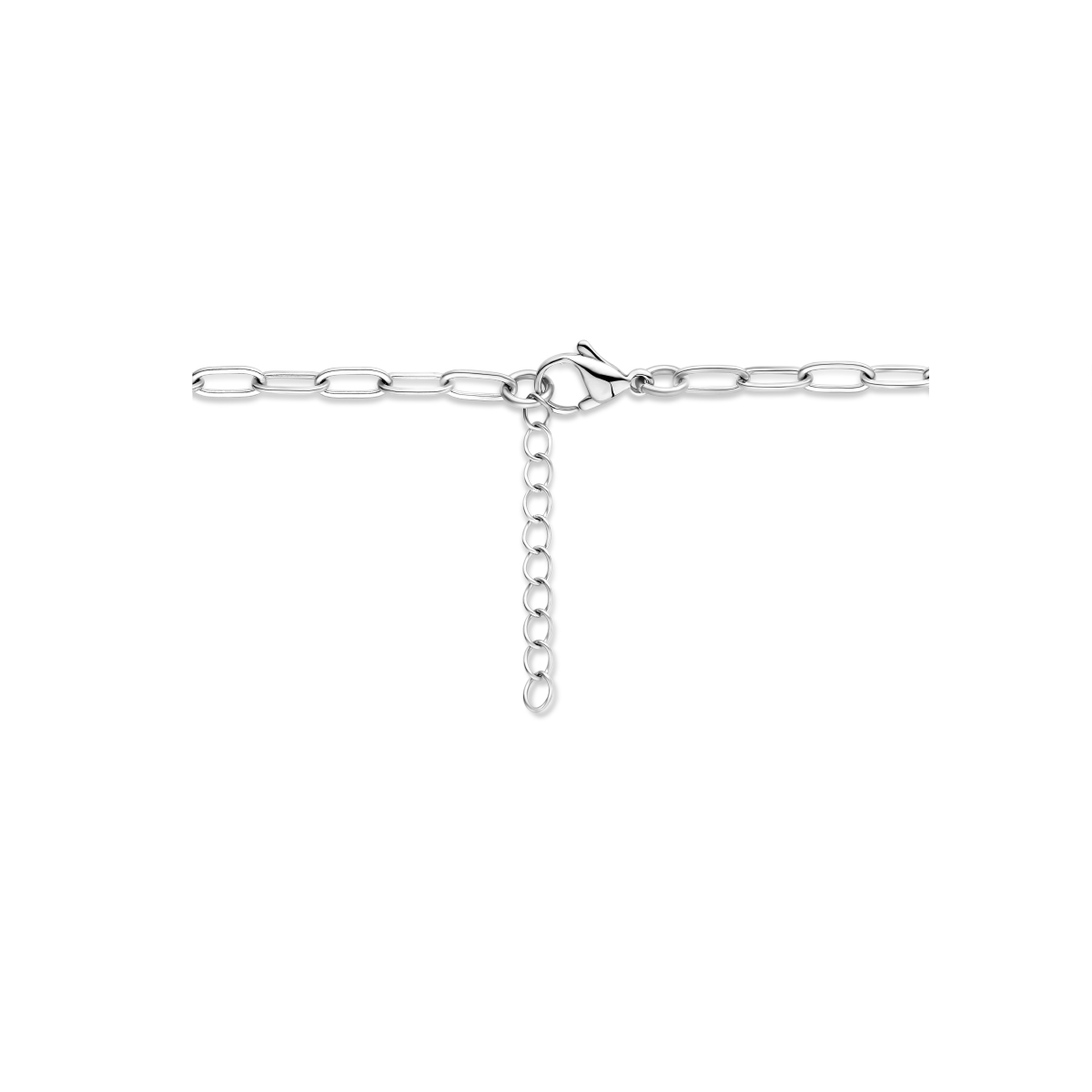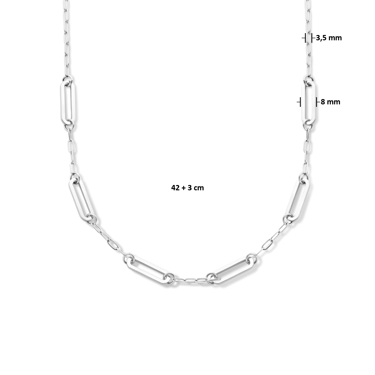 Stalen paperclip collier met schakelbreedtes van 3.5 en 8mm. Het collier heeft een draaglengte van 42cm met een extensie van 3cm en karabijn sluiting.