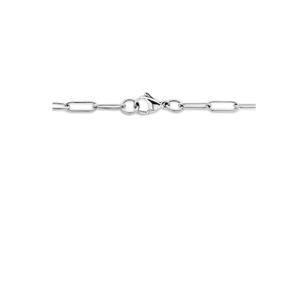Stalen paperclip collier uitgevoerd met een karabijn sluiting en een schakelbreedte van 8mm. Het collier heeft een draaglengte van 43cm met een extensie van 3cm.