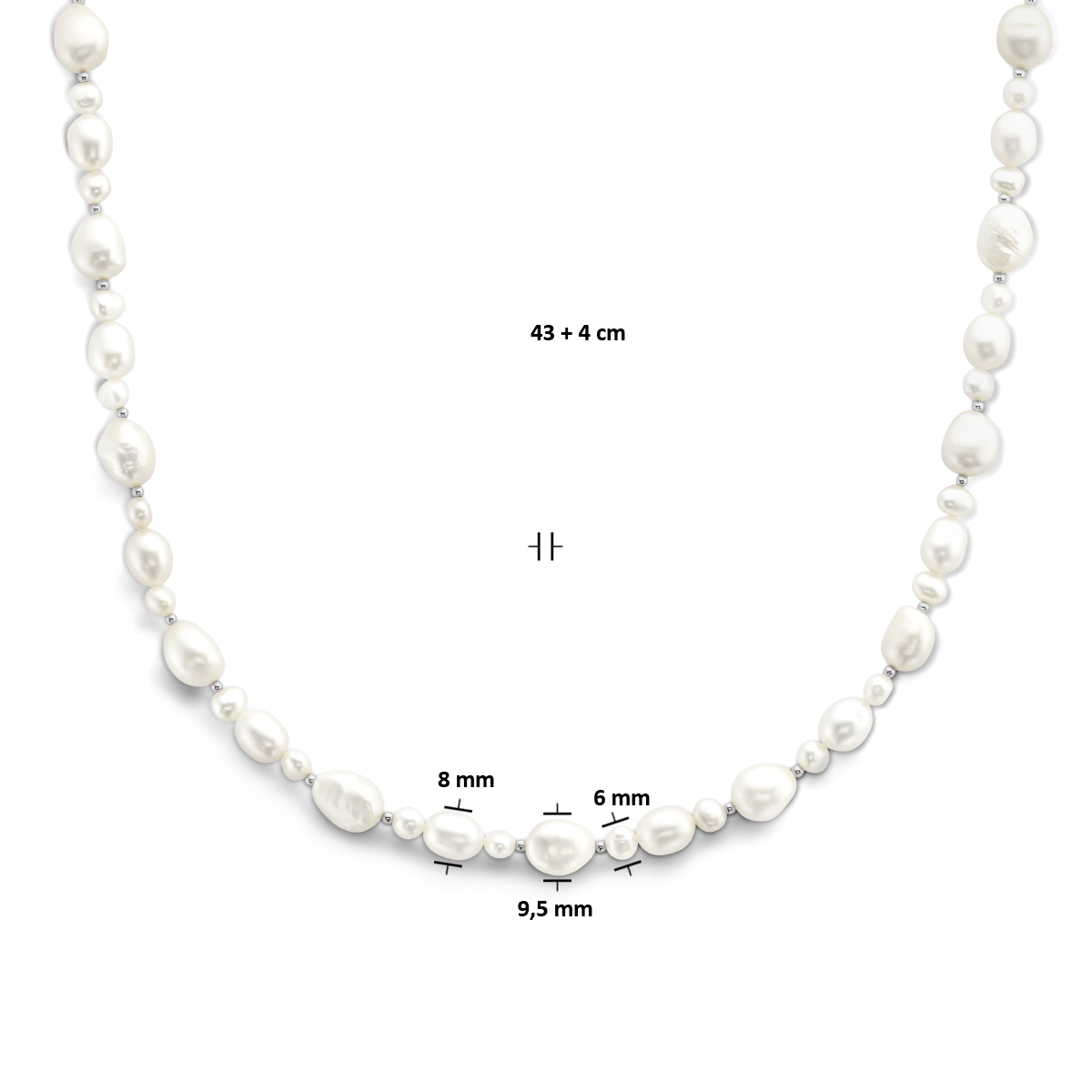 Gerhodineerd 925 zilveren collier met zoetwaterparels. Het collier heeft een draaglengte van 43cm en een extensie van 4cm. Uitgevoerd met een karabijn sluiting.