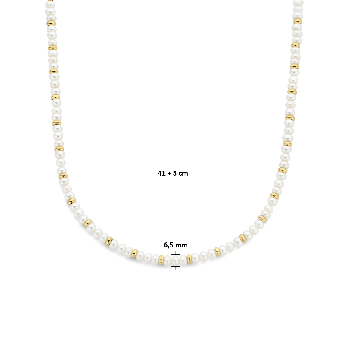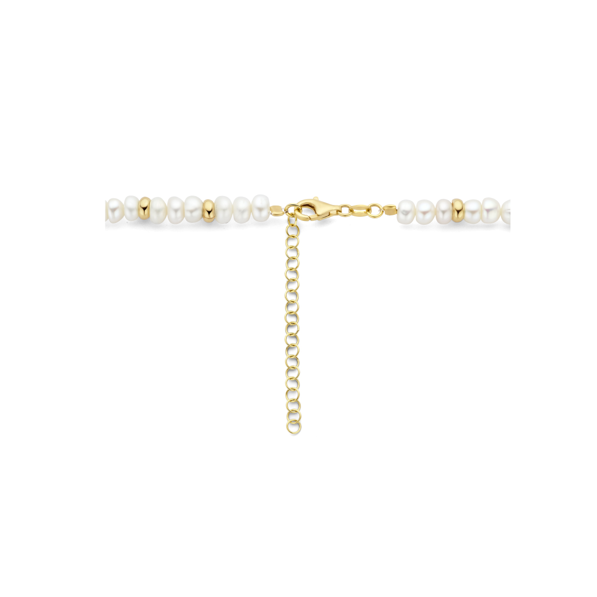Geelgoud op 925 zilveren collier uitgevoerd met schitterende zoetwaterparels. Het collier heeft een draaglengte van 41cm met 5cm extensie en is uitgevoerd met een karabijnsluiting. Geen garantie op plating.