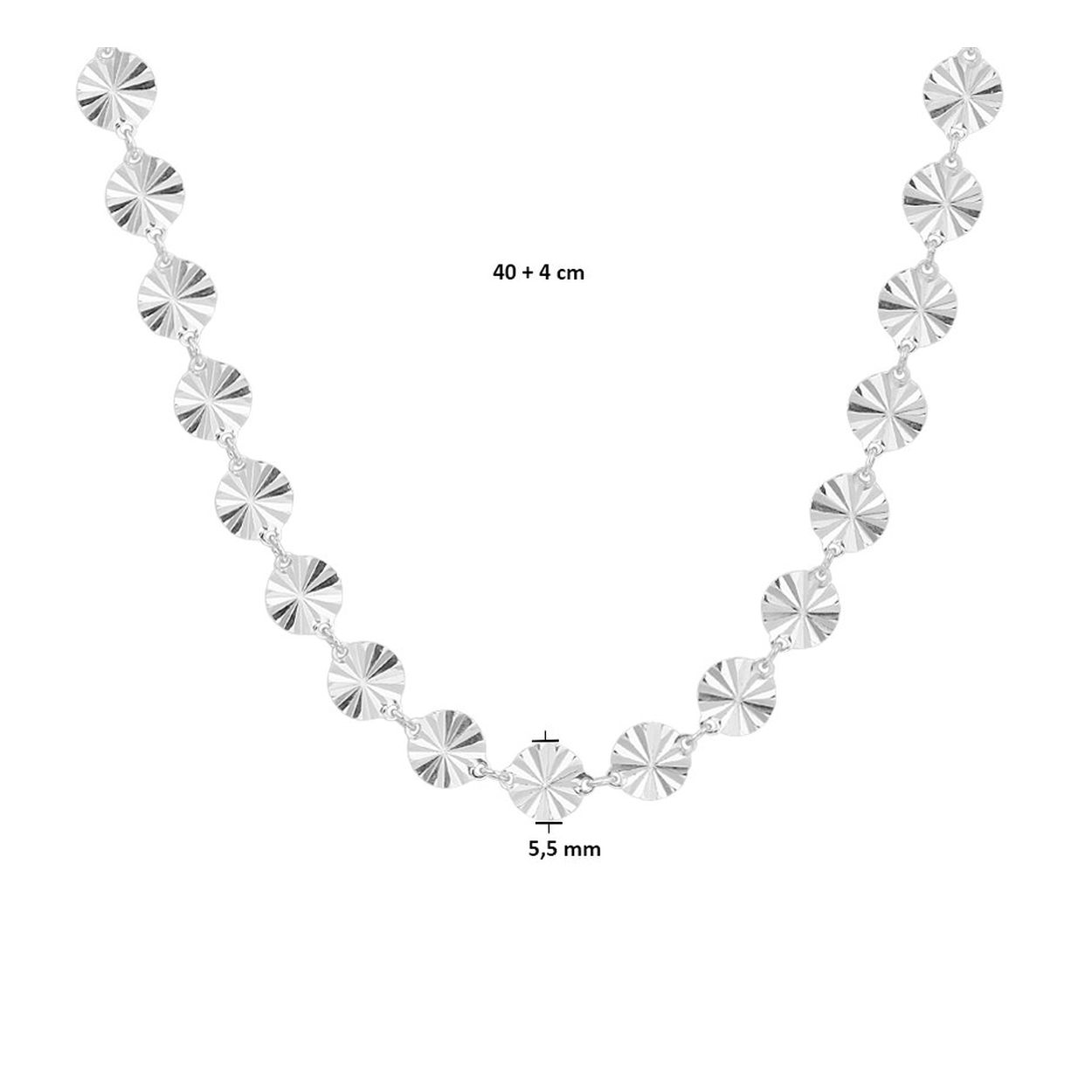 Gerhodineerd 925 zilveren collier uitgevoerd met rondjes met een gediamanteerde afwerking en een stevige karabijn sluiting. Het collier heeft een draaglengte van 40cm met een extensie van 4cm en een breedte van 5.5mm.