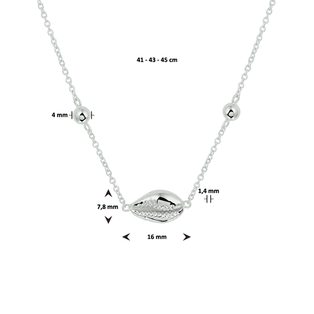Gerhodineerd 925 zilveren collier uitgevoerd met een schelp en een stevige karabijn sluiting. Het collier heeft draaglengtes van 41, 43 en 45cm.