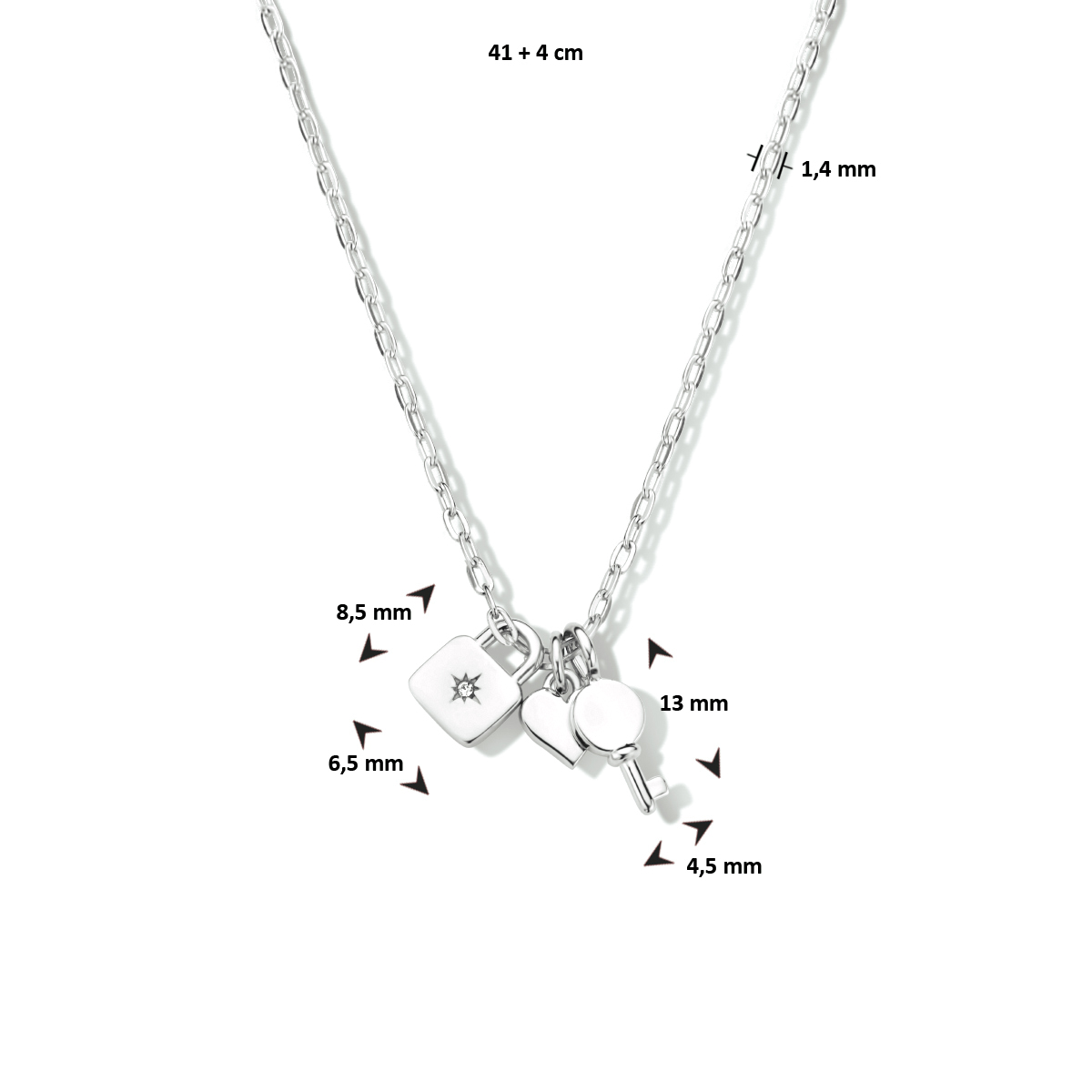 Gerhodineerd 925 zilveren collier uitgevoerd met een slot, hart en sleutel. Het collier heeft een draaglengte van 41cm en een extensie van 4cm.