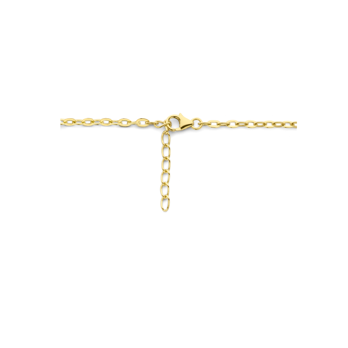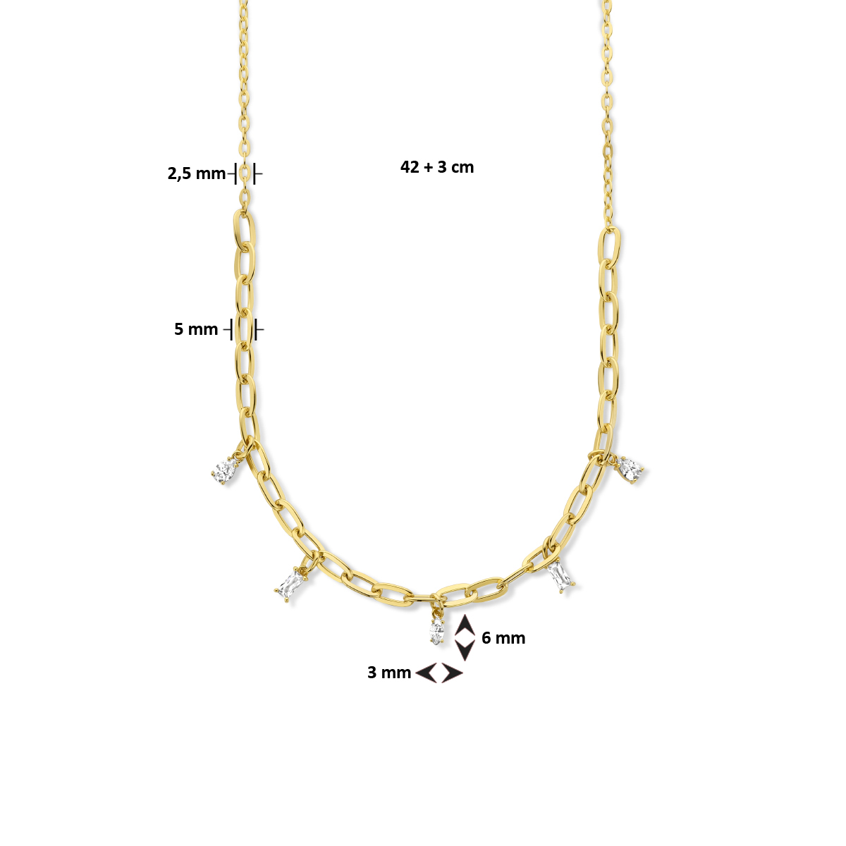 Geelgoud op 925 zilveren collier uitgevoerd met zirkonia stenen. Het collier heeft een draaglengte van 42cm met een extensie van 3cm. De schakelbreedte is 5.0mm. Geen garantie op de plating.