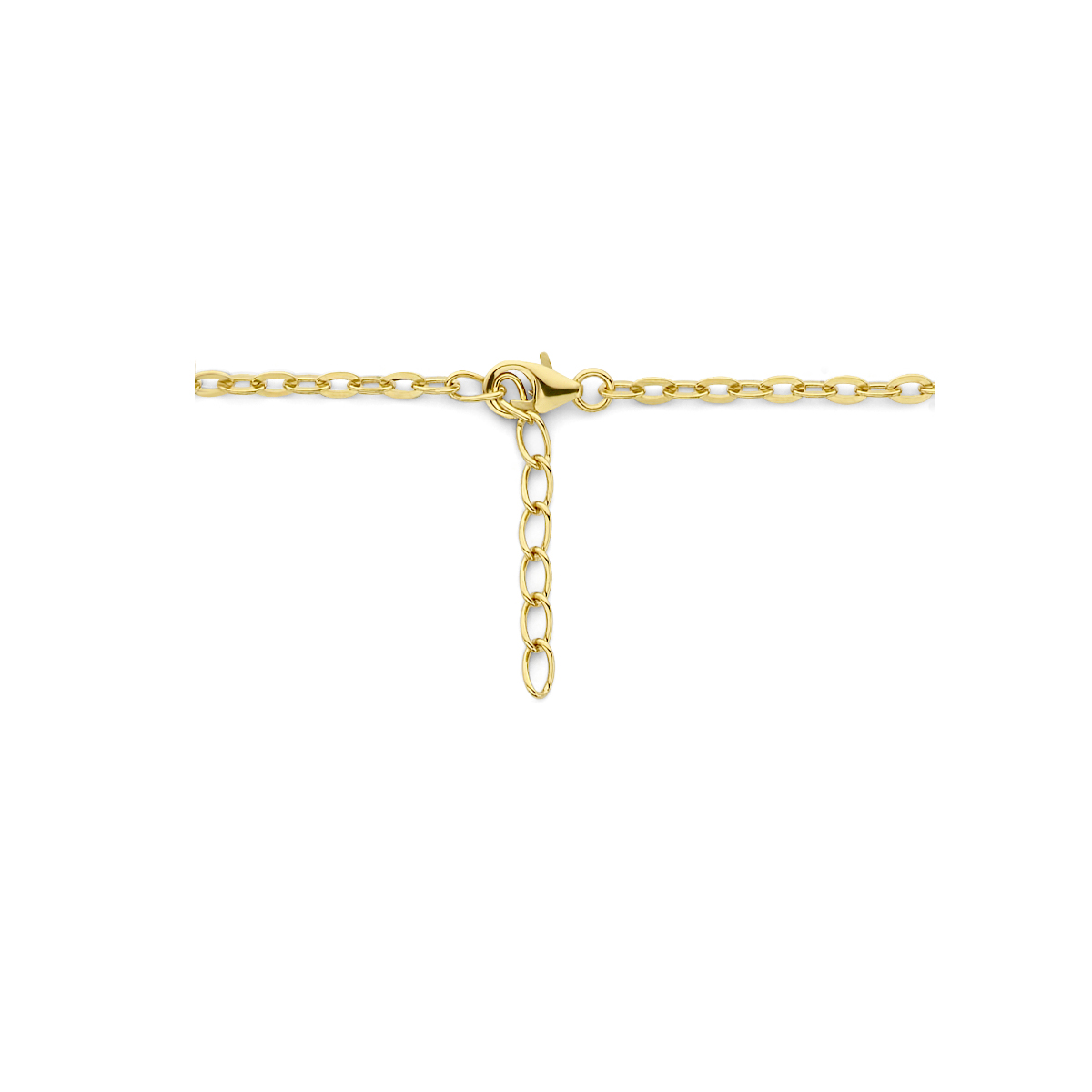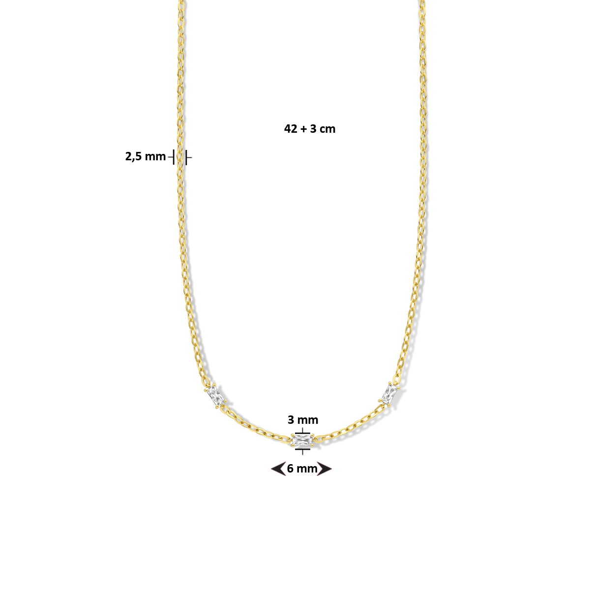 Geelgoud op 925 zilveren collier uitgevoerd met zirkonia stenen en een karabijn sluiting. Het collier heeft een draaglengte van 42cm met een extensie van 3cm. Geen garantie op de plating.