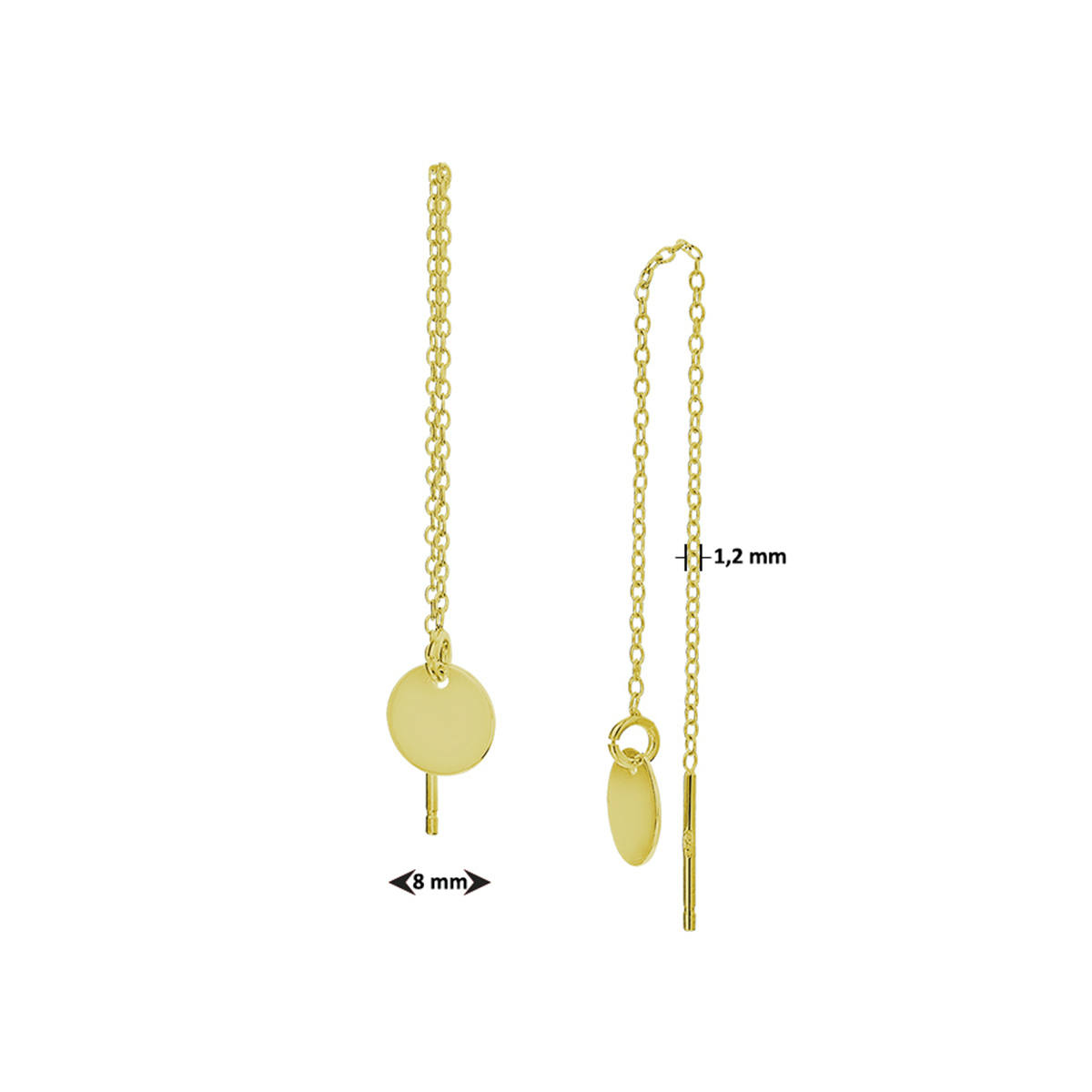 Verguld op 925 zilveren doortrekoorbellen uitgevoerd met een rondje. De oorbellen hebben een totale lengte van 9cm. Het rondje heeft een diameter van 8mm. Geen garantie op plating.
