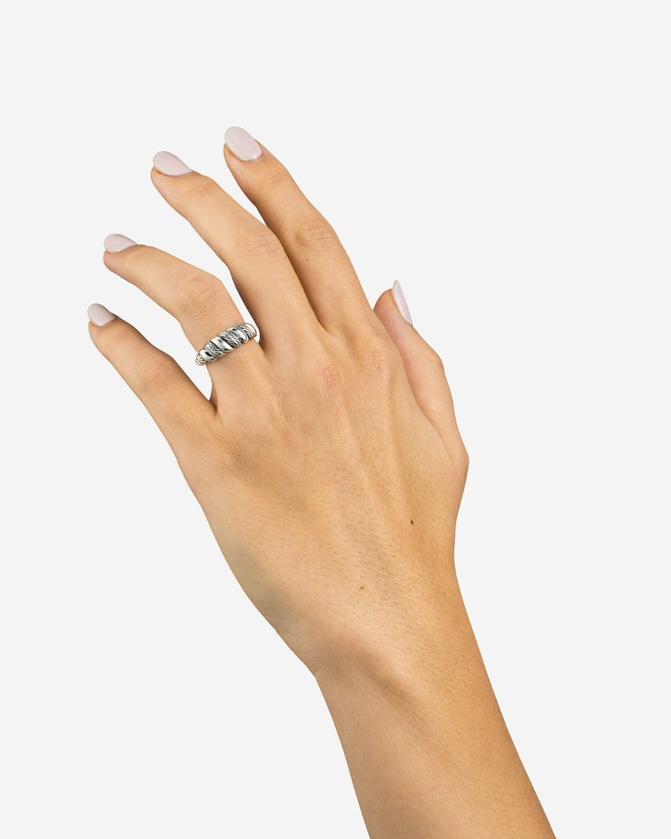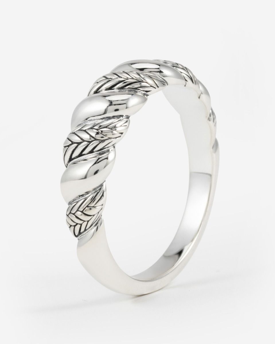 Geïnspireerd door de schoonheid van de natuur, symboliseert de Ring Ellen Spiraal Gradient creativiteit en energie met zijn unieke, draaiende ontwerp. Dit eigentijdse sieraad combineert textuurelementen van het iconische Ellen-weefpatroon met gepolijste details, wat een dynamisch contrast oplevert dat zowel schoonheid als kracht weerspiegelt. Het spiraalontwerp, bekend om zijn talismanische eigenschappen, staat voor groei en beweging, wat deze ring meer maakt dan alleen een statement—het is een betekenisvolle aanvulling op jouw sieradencollectie. Gemaakt van duurzaam gerecycled 925 sterling zilver en handgemaakt in Zuidoost-Azië, belichaamt de ring een mix van modern vakmanschap en tijdloze symboliek. Combineer het met de bijpassende hanger en oorbellen uit de Ellen Spiraal collectie en vier de kracht van creativiteit en verbinding.