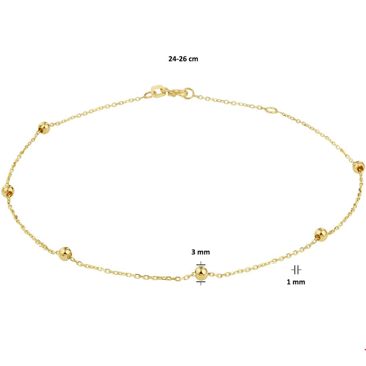 Beschrijving: Geelgouden 1mm anker enkelbandje met draaglengtes van 24 en 26cm uitgevoerd met poli afgewerkte bolletjes van 3mm. De armband is te combineren met bijpassende sieraden uit onze collectie.Tip: Leuk om kado te geven!