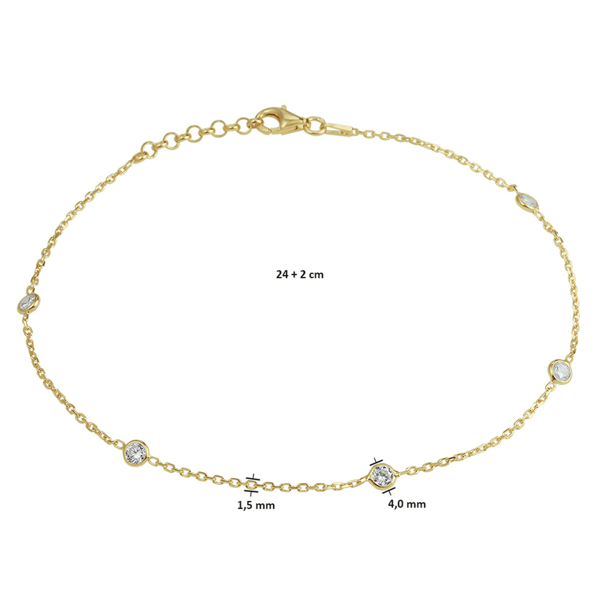 Geelgoud op 925 zilveren enkelbandje uitgevoerd met een schitterende zirkonia rij. Het enkelbandje heeft een draaglengte van 24cm met een extensie van 2cm en een breedte van 4mm. Het enkelbandje is uitgevoerd met een stevige karabijn sluiting. De schakelbreedte is 1.5mm. Geen garantie op plating.