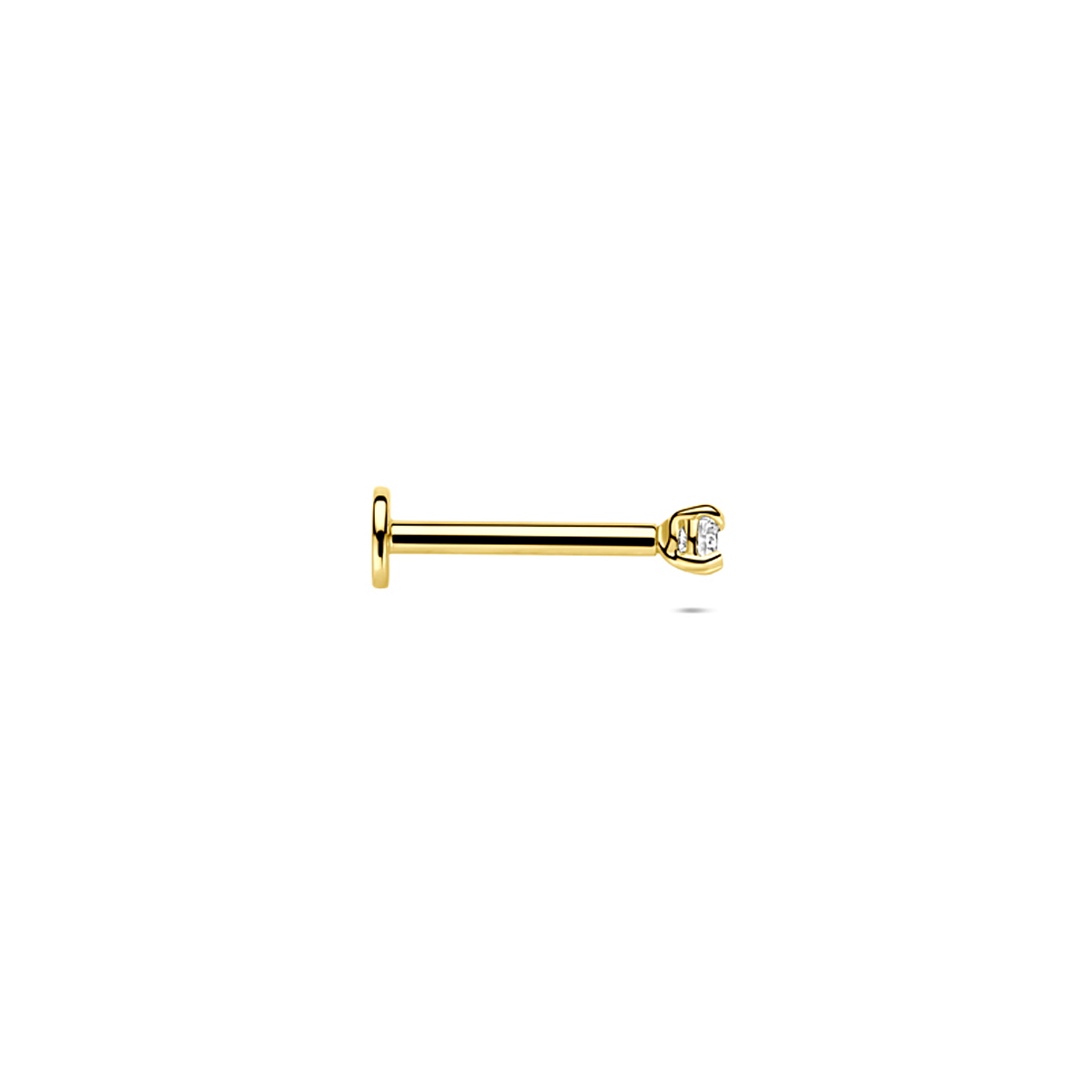 14k Geelgouden flat back piercing uitgevoerd met zirkonia en heeft een diameter van 2mm.