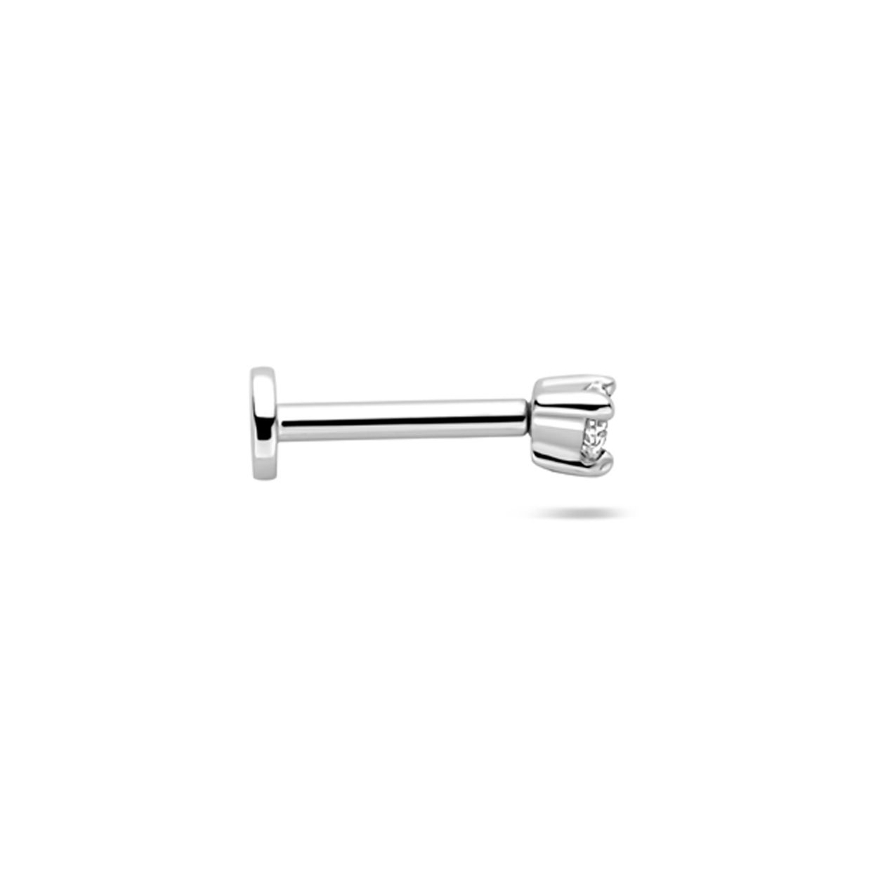 Gerhodineerd 925 zilveren flat back piercing met zirkonia en schroefdraad. Deze piercing heeft een afmeting van 3x2.5mm, een buis lengte van 8mm en een buisdikte van 1mm. Let op, per stuk leverbaar.