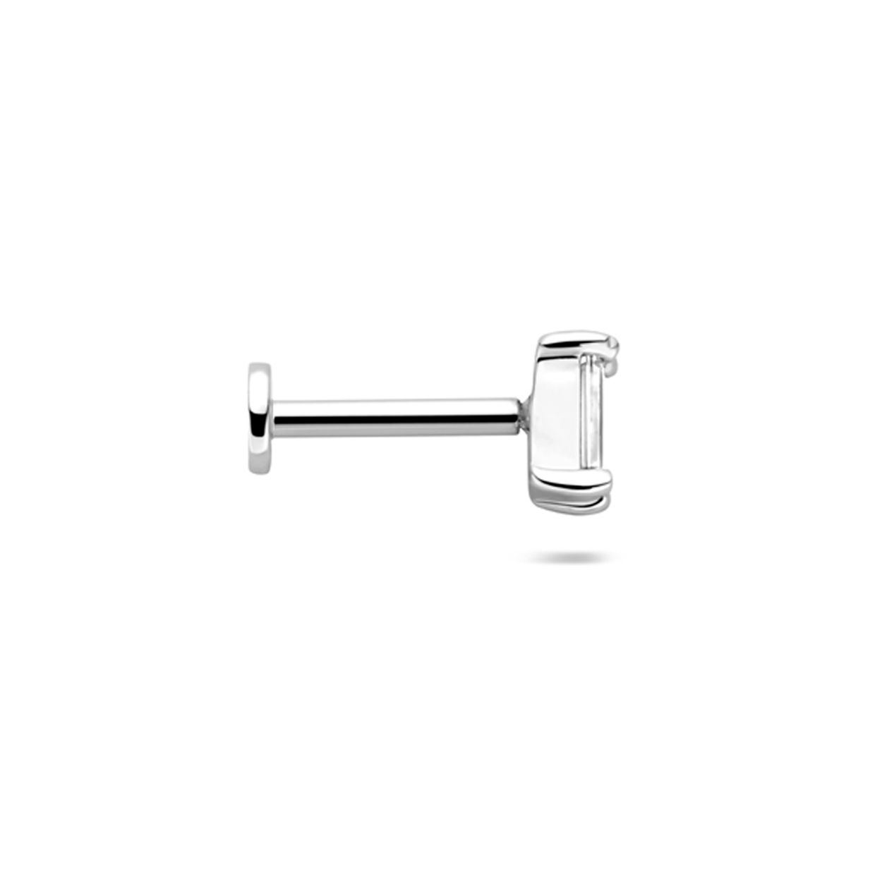 Gerhodineerd 925 zilveren flat back piercing met zirkonia en schroefdraad. Deze piercing heeft een afmeting van 4.5x3mm, een buis lengte van 9mm en een buisdikte van 1mm. Let op, per stuk leverbaar.
