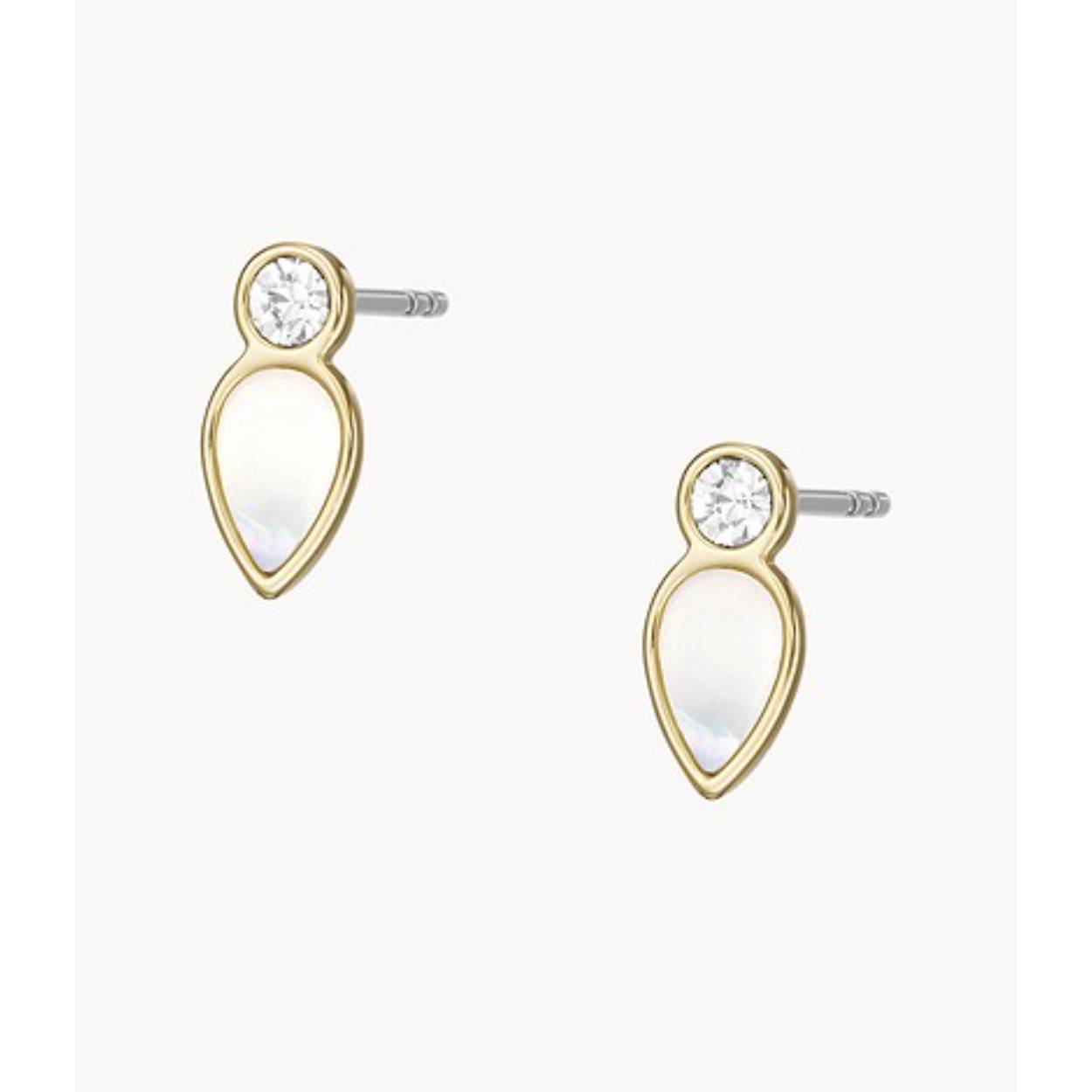 Deze oorknopjes zijn gemaakt van goudkleurig roestvrij staal, wit parelmoer en hebben sluitingen achter de oren.