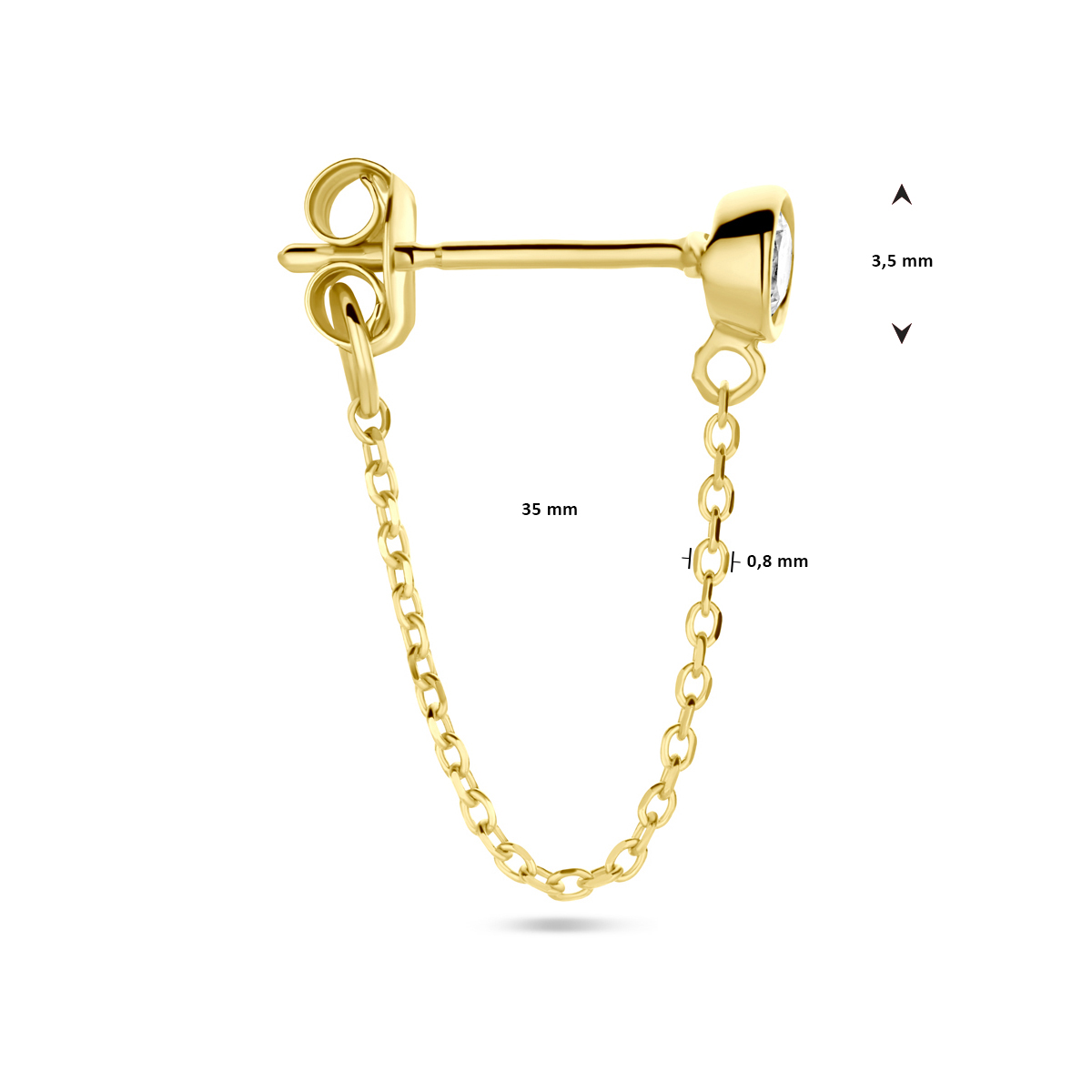 14k Geelgoud oorknop uitgevoerd met zirkonia. Met een diameter van 3.5mm. Deze oorsieraden worden per stuk verkocht ipv per paar.