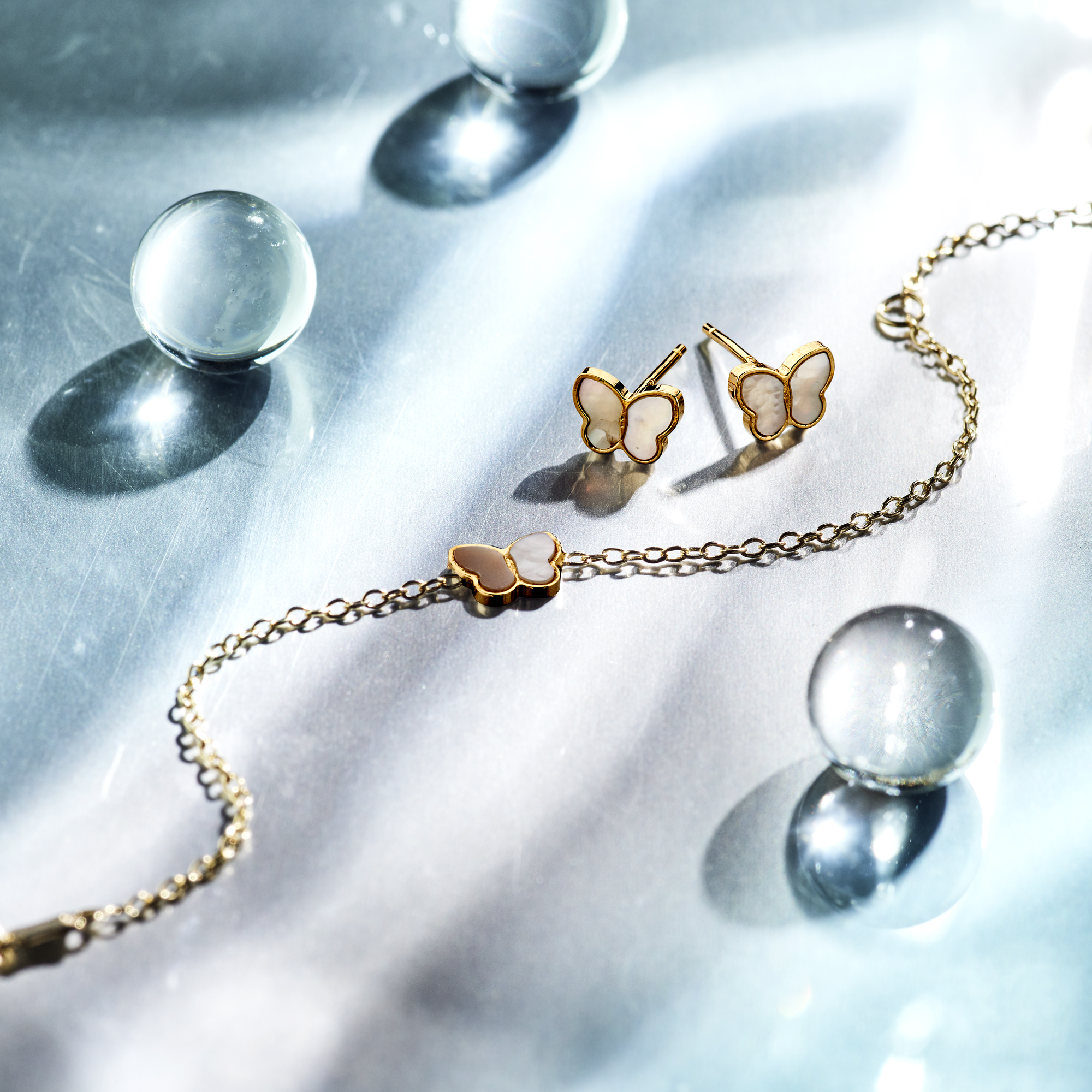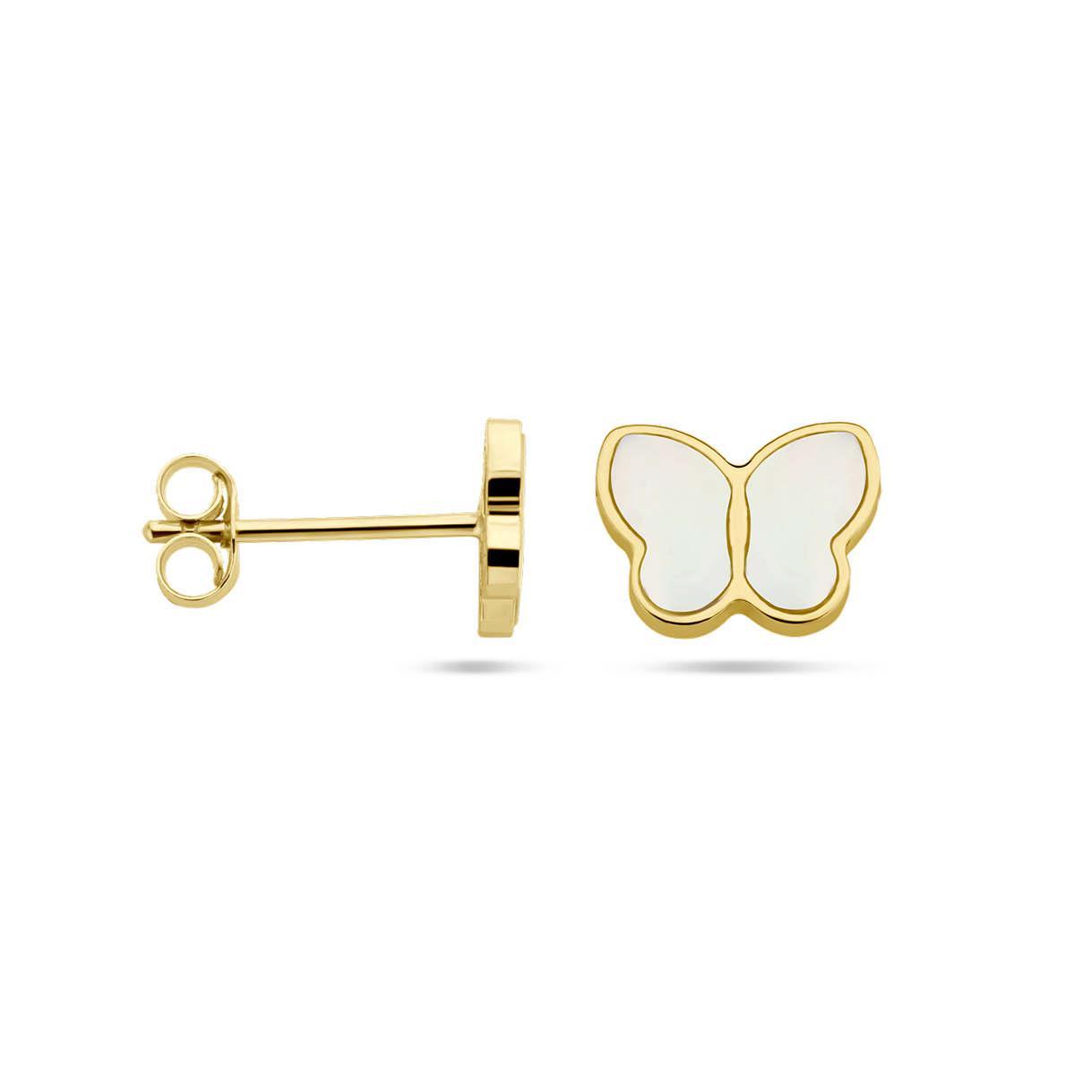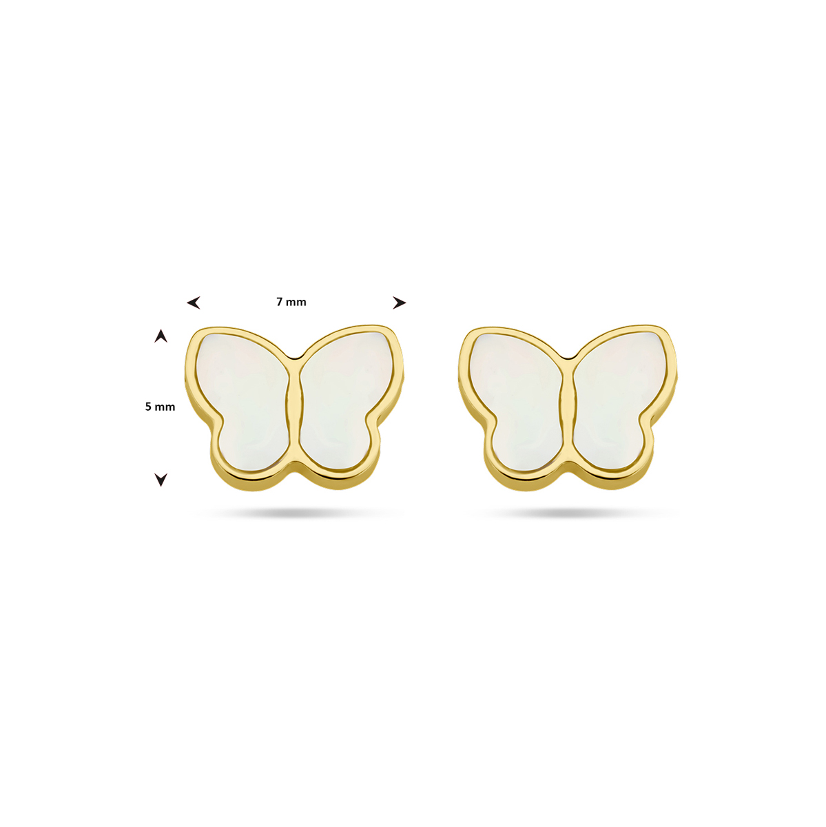 14k Geelgouden oorknoppen uitgevoerd in de vorm van een vlinder met parelmoer. De oorknoppen hebben een afmeting van 5x7mm.