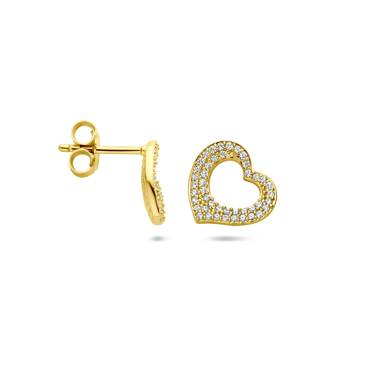 Verguld op 925 zilveren hart oorknoppen uitgevoerd met zirkonia. De oorknoppen hebben een afmeting van 10x11mm. Geen garantie op plating.