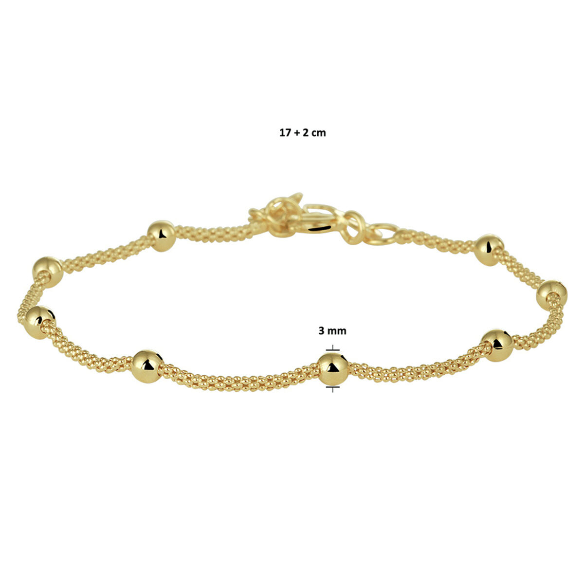 Trendy verguld op zilveren armband met een draaglengte van 17cm en een extensie van 2cm. Minimalistisch design uitgevoerd met bolletjes van 3mm voor een exclusieve uitstraling. Geen garantie op plating.
