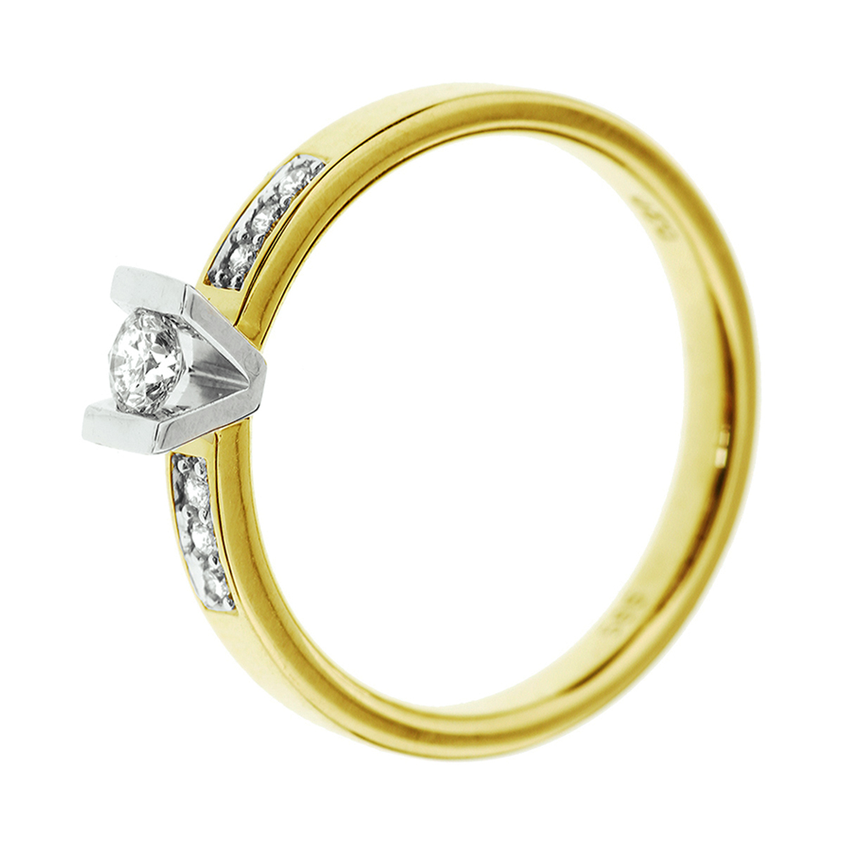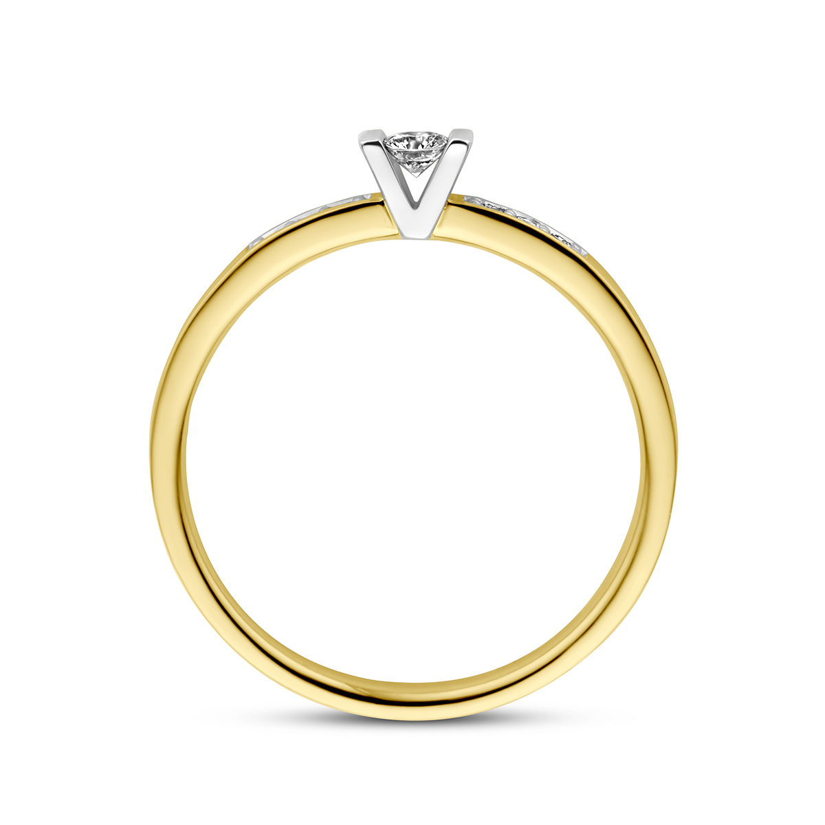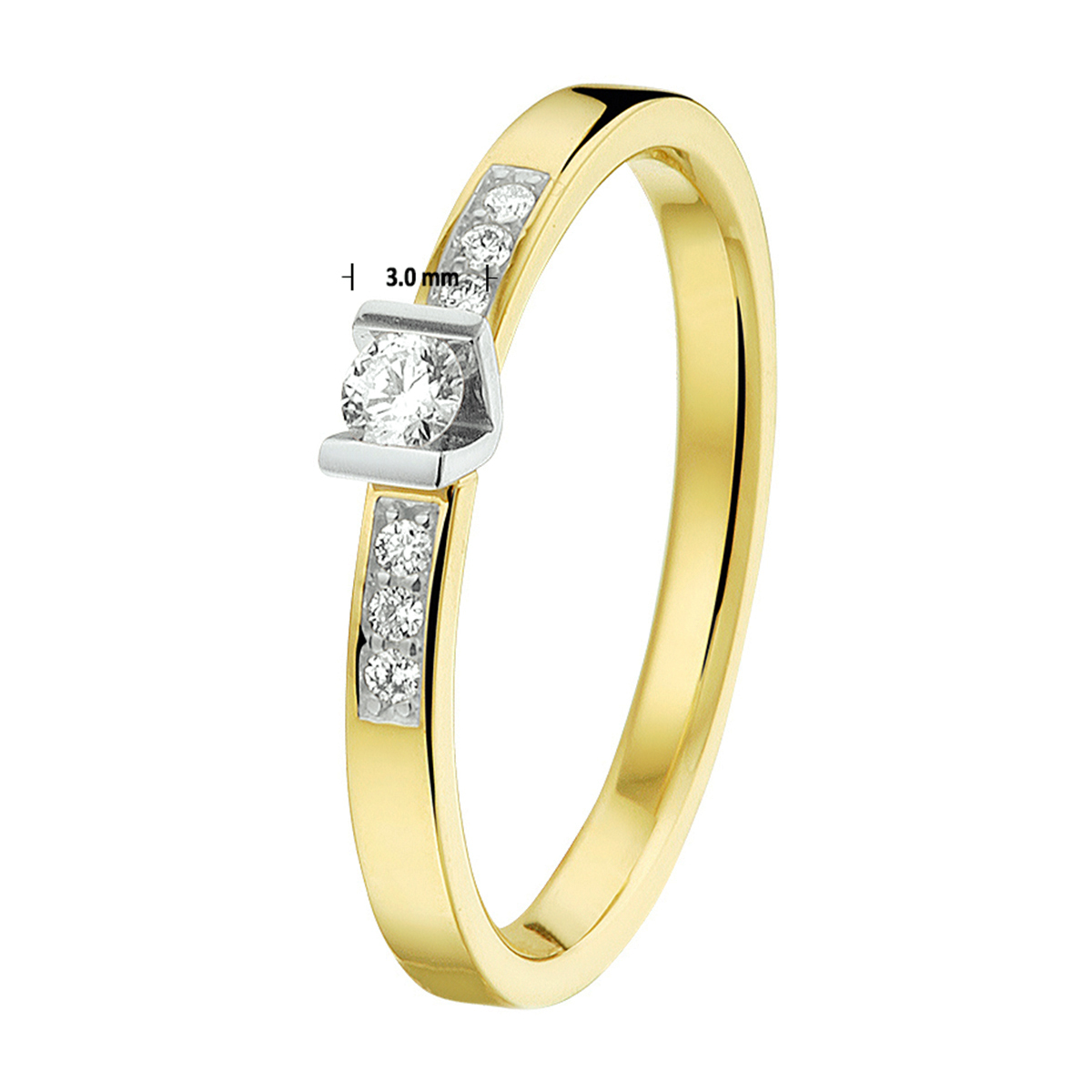 Geel/witgouden dames ring met briljant. Maat 17,5.