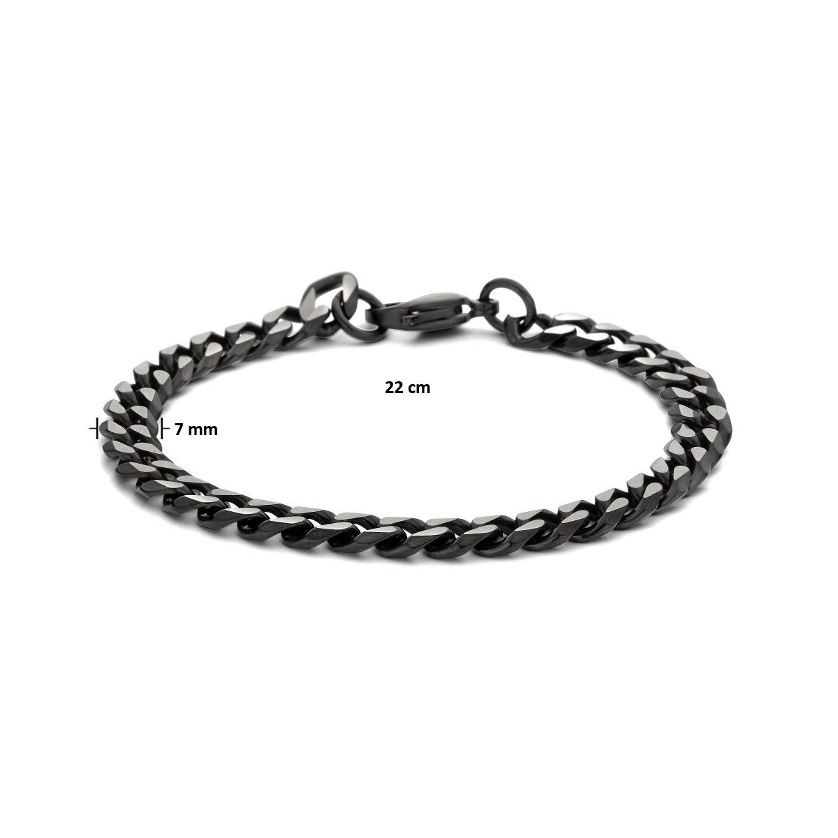 Stalen gourmette armband met een zwartkleurige ion plating. De armband heeft een schakelbreedte van 7mm en een karabijn sluiting.