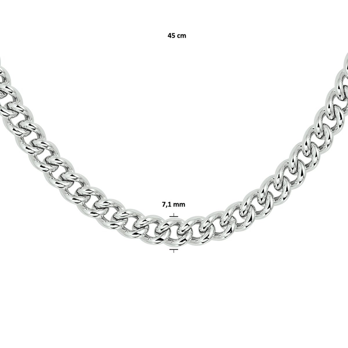 Beschrijving: Stoer gerhodineerd zilveren collier met een gourmet schakel. Het collier heeft een schakelbreedte van 7,1mm en draaglengte van 45cm. Uitgevoerd met een stevige karabijn sluiting. Info: Gerhodineerd zilver is door de rhodiumlaag beter bestand tegen verkleuren en krassen.