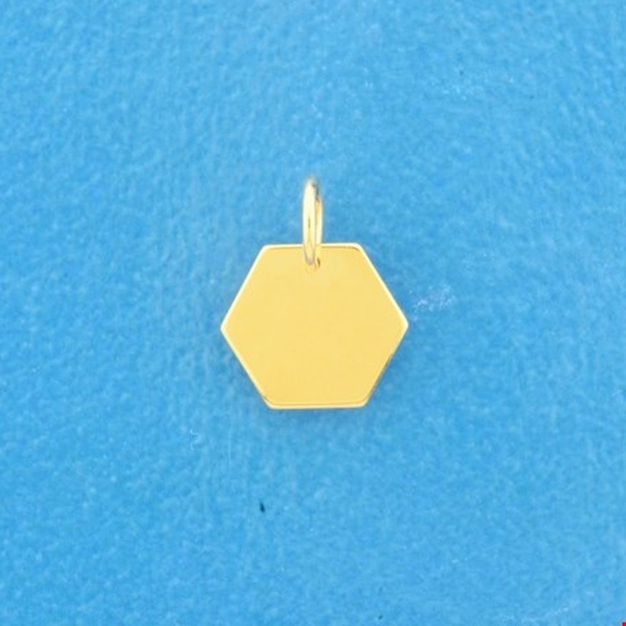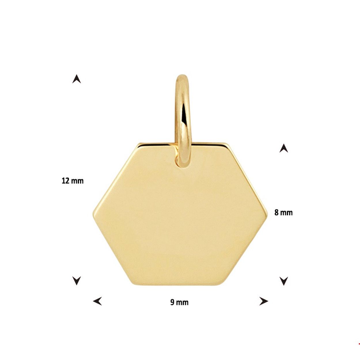 Beschrijving: 14k Geelgouden graveerhanger in de vorm van een zeshoek.
