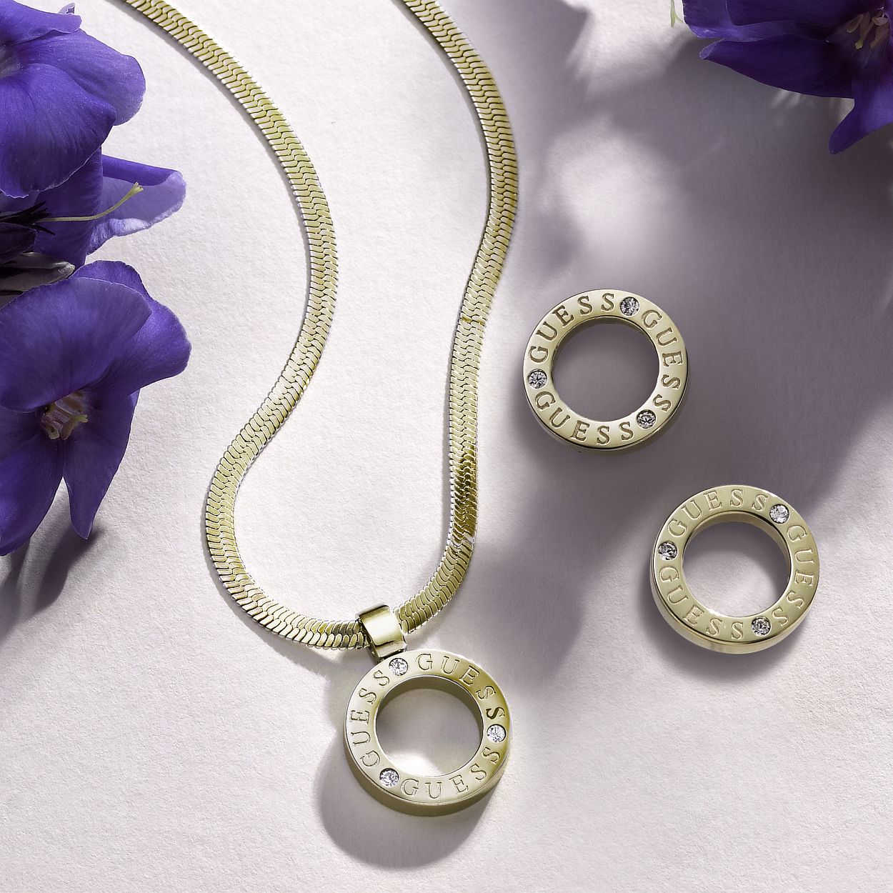 De CIRCLE LIGHTS goudkleurige ronde oorstekers van Guess Jewellery zijn rondom gegraveerd met het Guess logo en gezet met kristallen. De stekers hebben een diameter van 12 mm en zijn de perfecte set met de 'snake' armband JUBB03172JWYG-S en collier JUBN03171JWYGT-U.