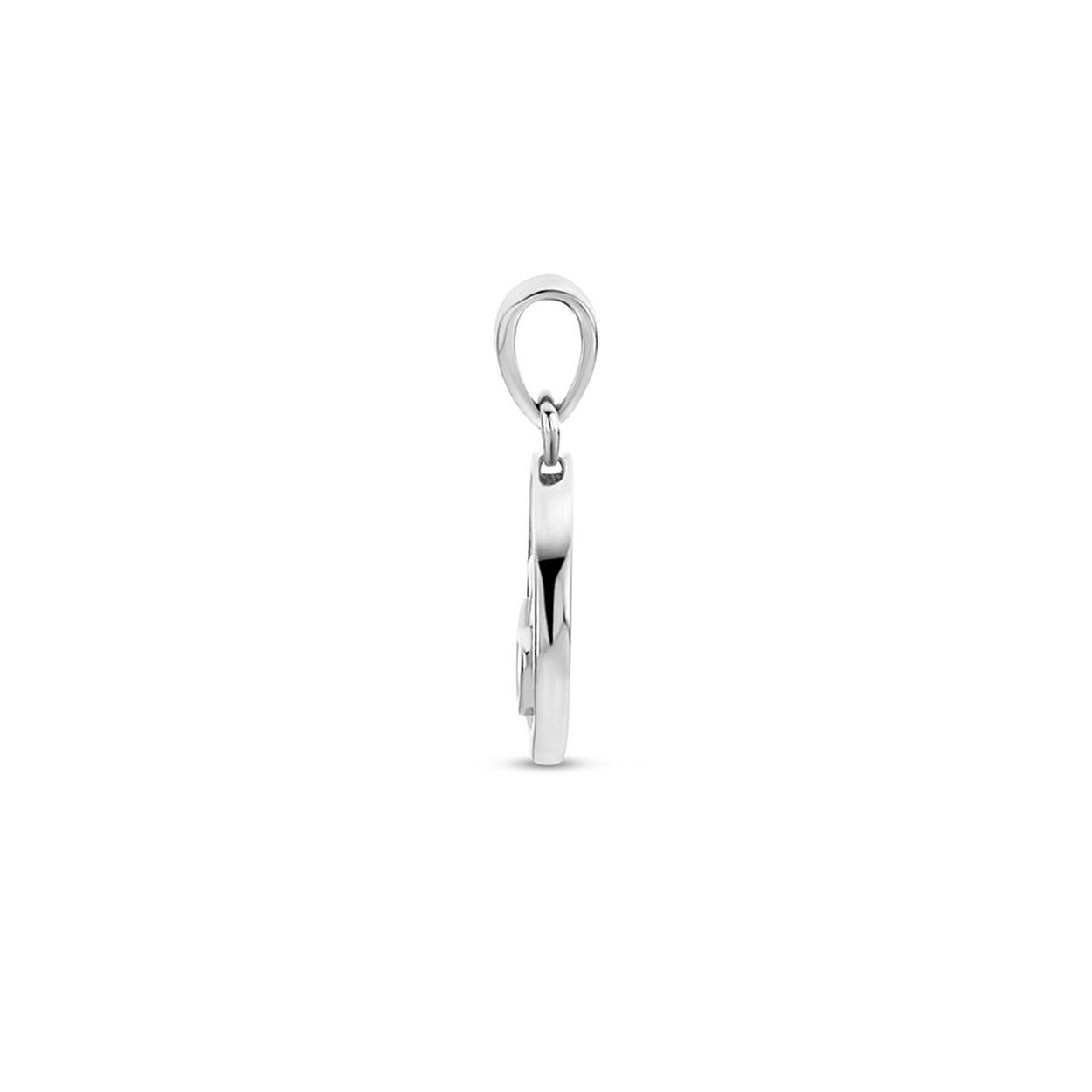 Gerhodineerd 925 zilveren ronde hanger met daarin twee hartjes en een heldere zirkonia. De hanger heeft een totale hoogte van 1.8cm en een diameter van 12mm.