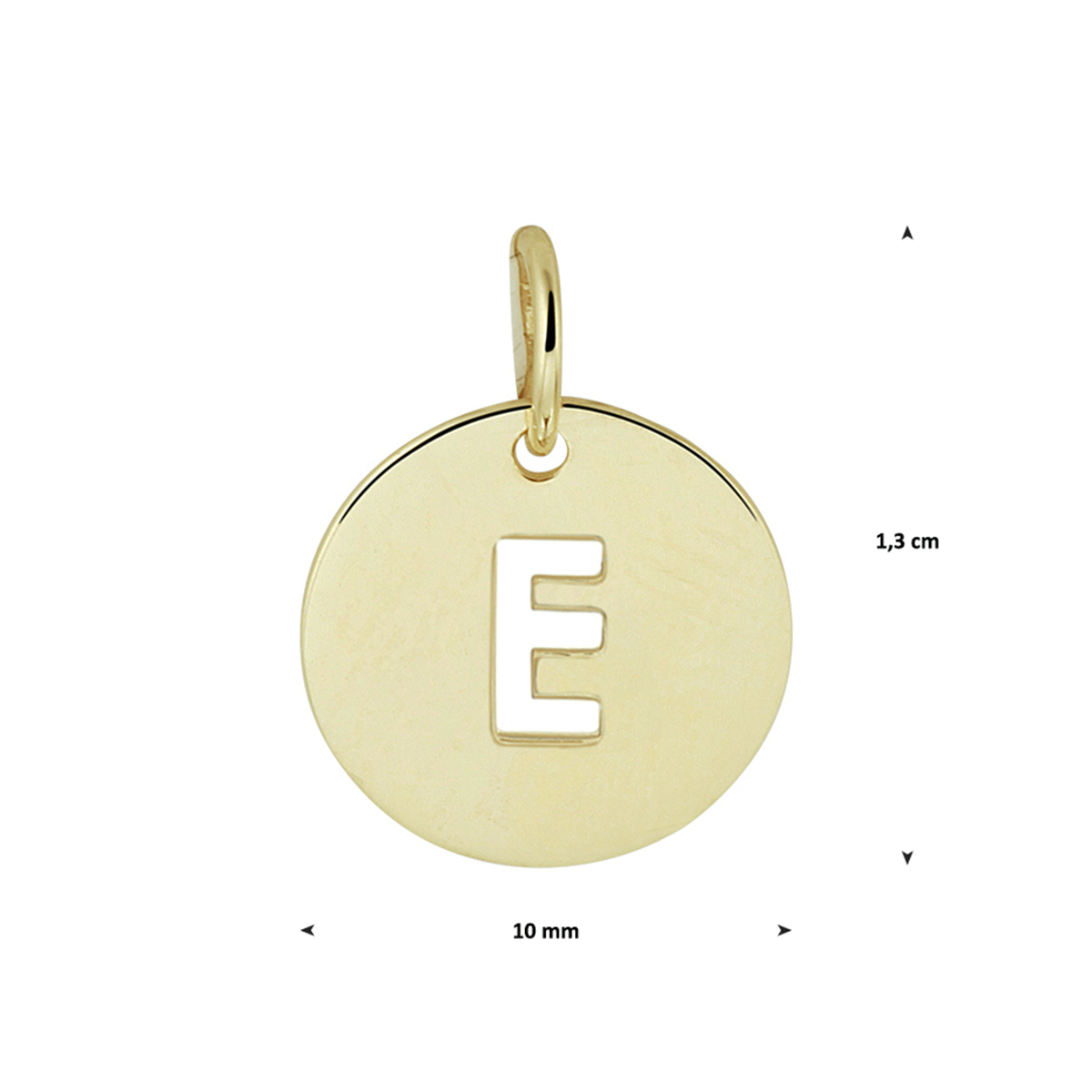 Geelgouden ronde letter E hanger. De hanger heeft een diameter van 10mm en een totale hoogte van 13mm. Tip: Combineer deze betekenisvolle hanger met een bijpassend collier en geef deze cadeau aan een speciaal persoon.