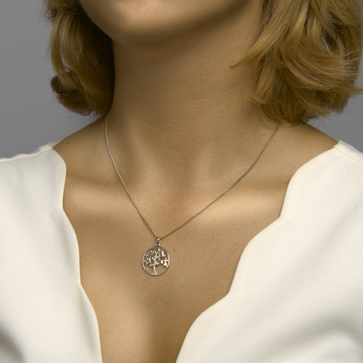 Gerhodineerd 925 zilveren hanger uitgevoerd met een levensboom en schitterend zirkonia. De hanger heeft een totale hoogte van 2cm en een diameter van 19.5mm.