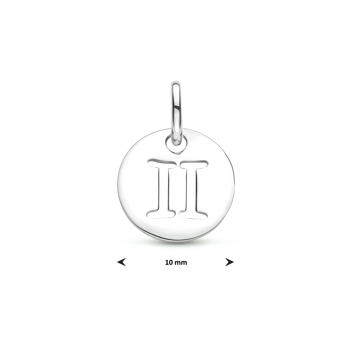 Gerhodineerd 925 zilveren hanger uitgevoerd met het sterrenbeeld tweeling. De hanger heeft een totale hoogte van 1.3cm en een diameter van 10mm.