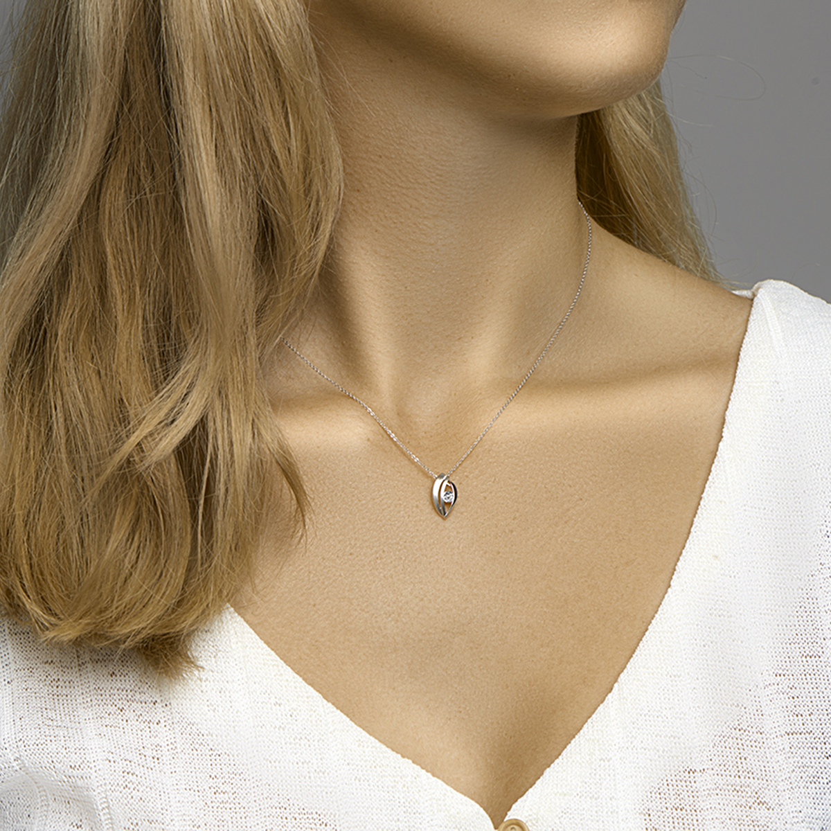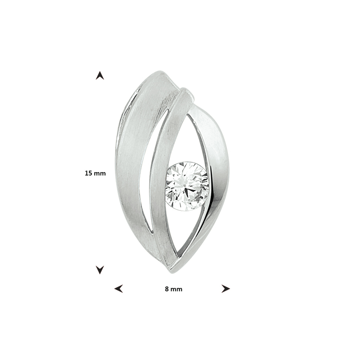 Gerhodineerd 925 zilveren hanger uitgevoerd met een heldere zirkonia en een poli/matte afwerking. De hanger heeft een afmeting van 15x8mm.