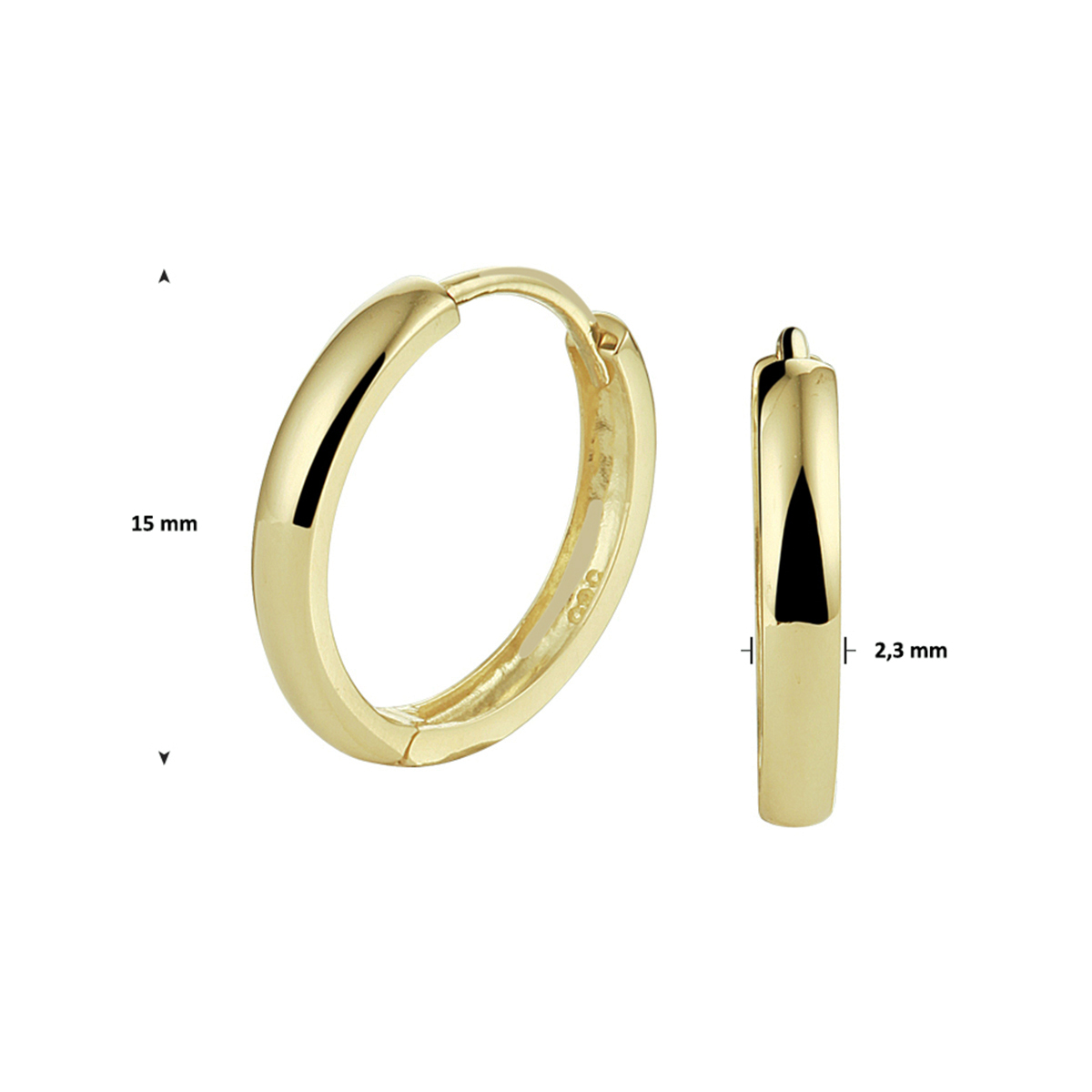 Klassieke geelgouden klapoorringen met een afmeting van 15x2.3mm uitgevoerd met een stevige scharnier sluiting. Door het simplistische design zijn deze klapoorringen perfect te combineren met andere sieraden uit onze collectie of vanuit je eigen sieraden stash.