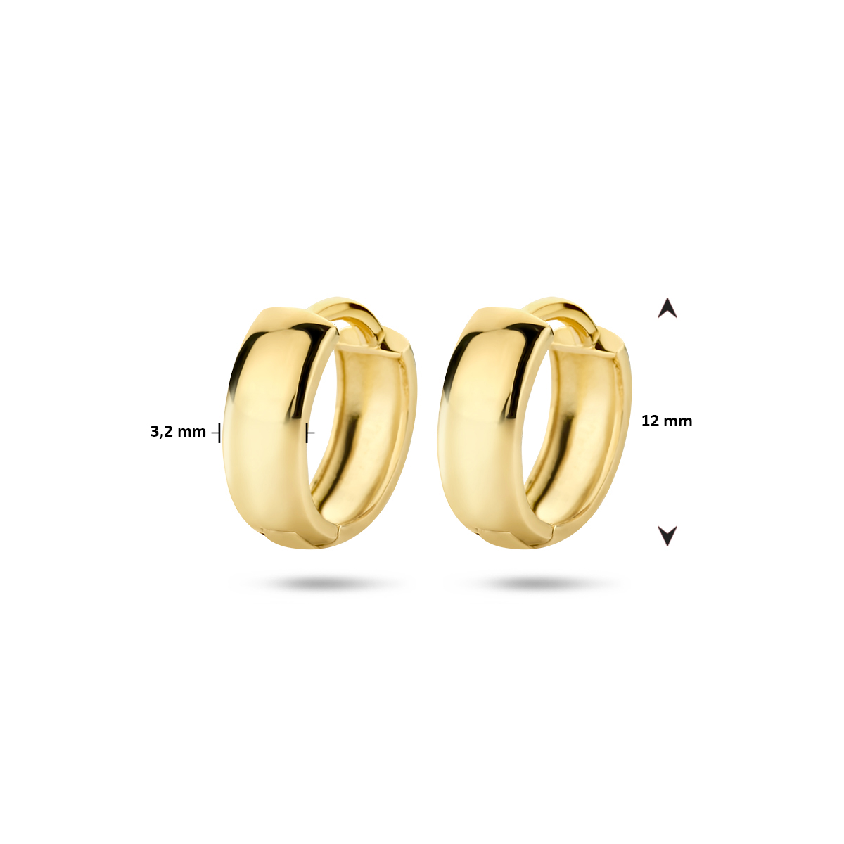 Geelgouden klapcreolen met een afmeting van 12x3.2mm uitgevoerd met een stevige scharnier sluiting. Door het simplistische design zijn deze klapcreolen perfect te combineren met andere sieraden uit onze collectie of vanuit je eigen sieraden stash.