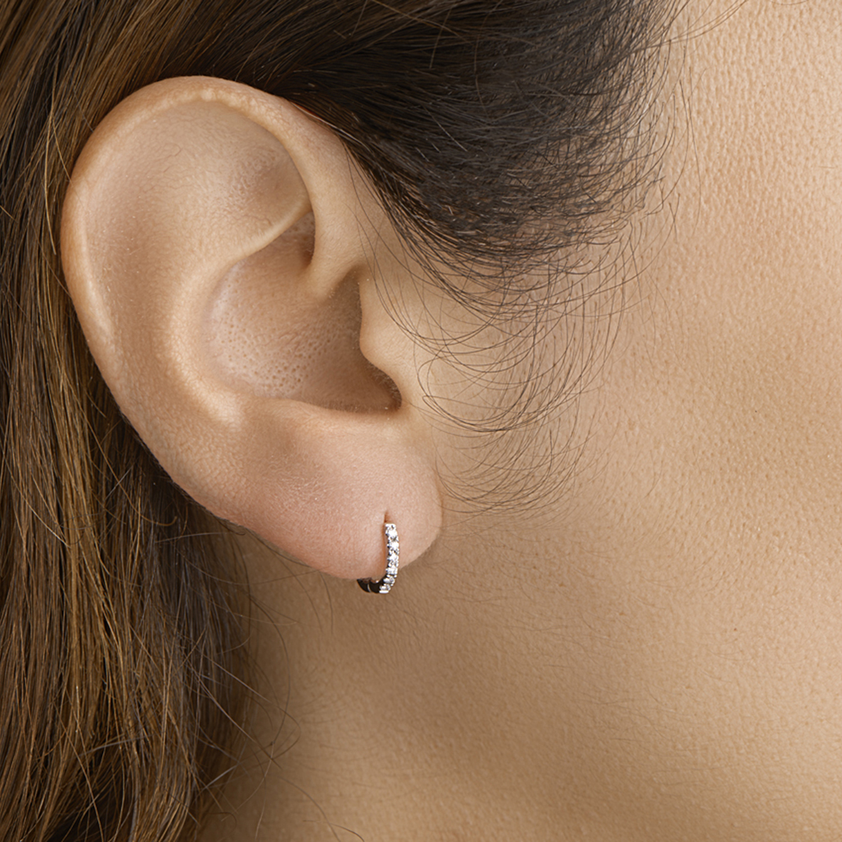 14k Witgouden oorringen met scharnier uitgevoerd met een schitterende diamant rij. De oorringen hebben een afmeting van 9x1.5mm.