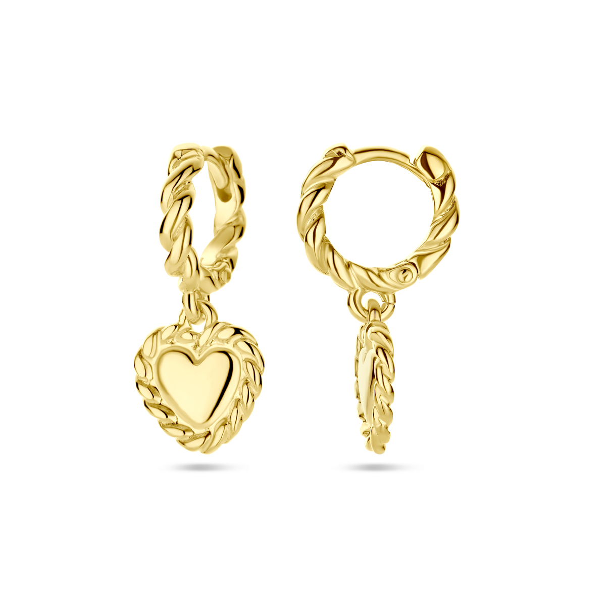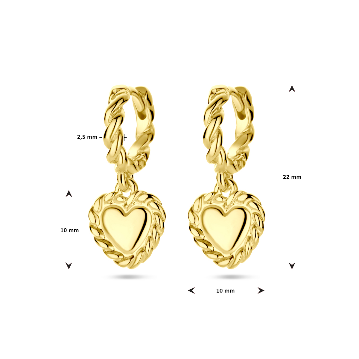 Geelgoud op 925 zilveren oorringen uitgevoerd met een hart. De oorringen hebben een totale hoogte van 22mm. Geen garantie op de plating.